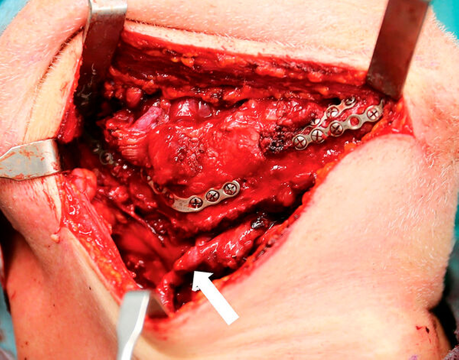Bei unserem Patienten haben wir uns zur mandibulären Rekonstruktion für ein vaskuläres Fibulatransplantat entschieden, da neben dem Knochendefekt auch ein durch die Tumorresektion entstandener intraoraler Weichteildefekt gedeckt werden musste und dies durch eine gleichzeitige Mitentnahme eines lokal gestielten Hautlappens ermöglicht wurde.