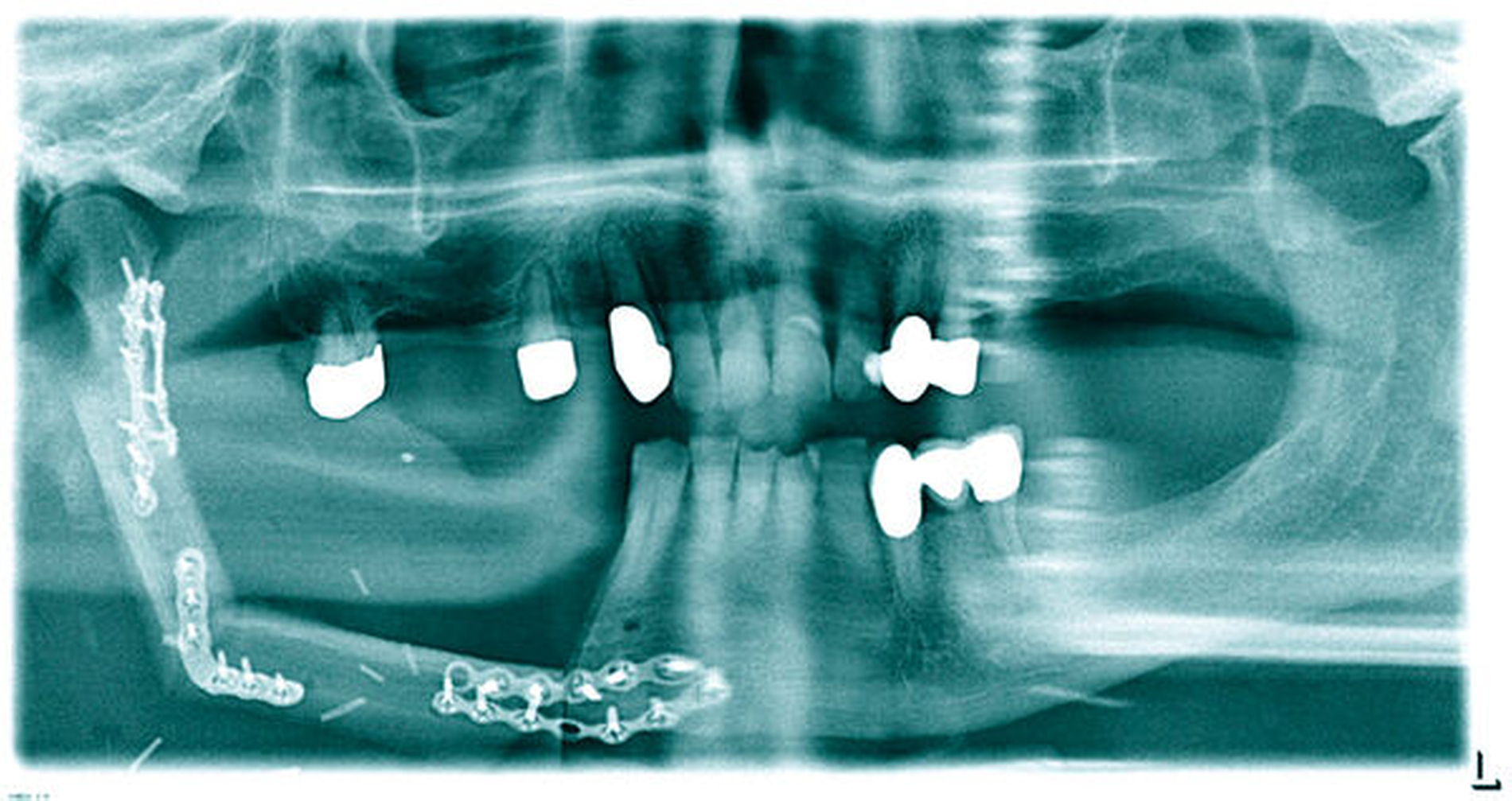 Die ablschießende Histologie ergab die In-sano-Resektion des PEC ohne nachweisbaren Lymphknotenbefall [pT2, pN0 (0/19), L0, V0, Pn0, G1, R0] (UICC, 8. Auflage). Das postoperativ angefertigte Orthopantomogramm dokumentiert die Rekonstruktion des Unterkiefers mit dem eingebrachten zweisegmentalen Fibulatransplantat und dessen Fixierung mit Osteo-synthesematerial (Abbildung 8).