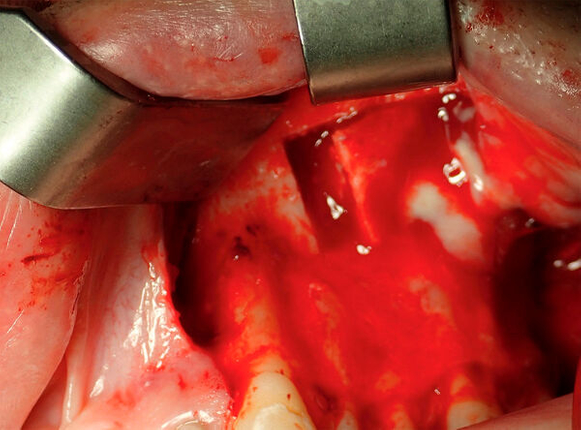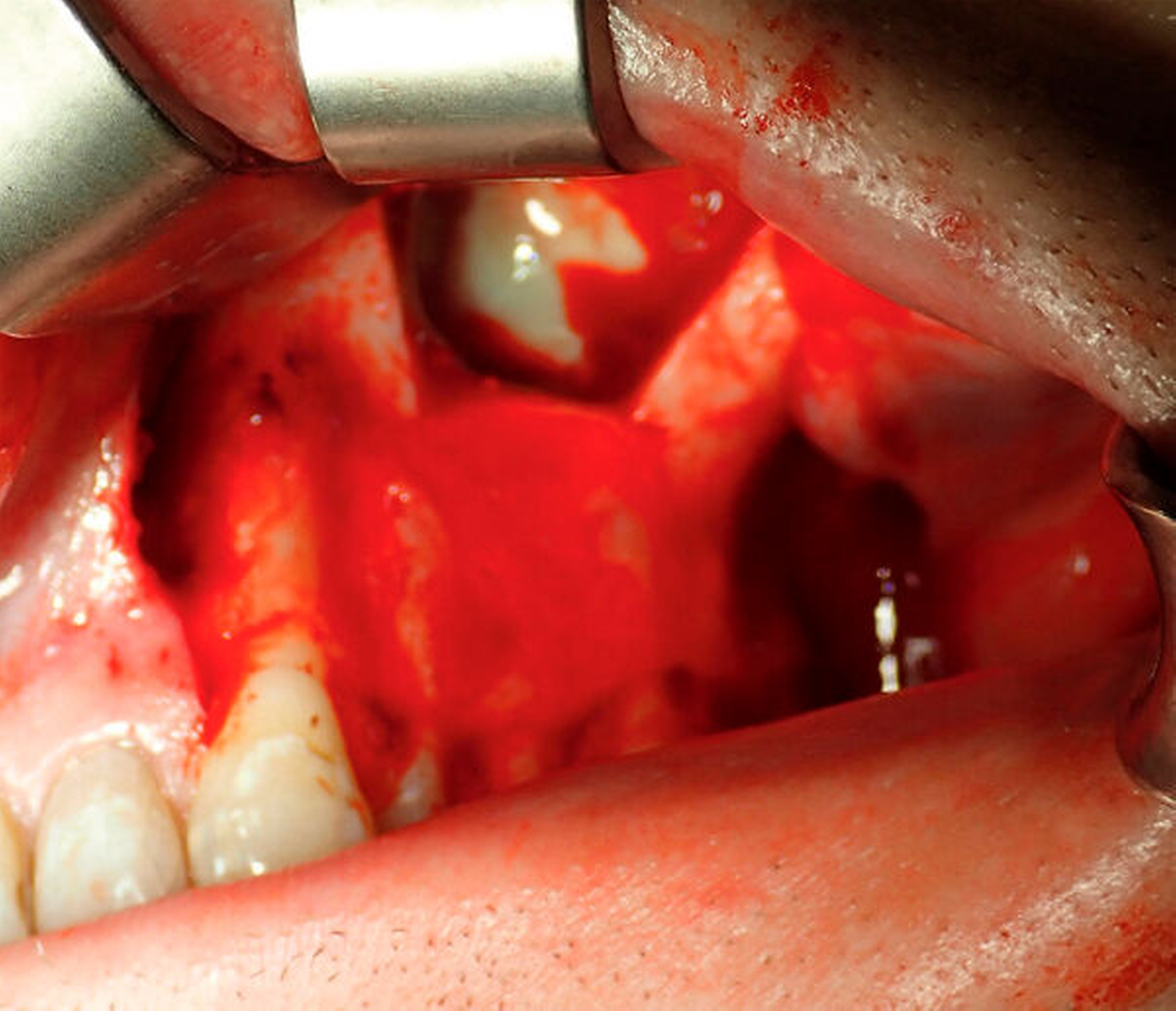 Nach ausführlicher Aufklärung und Einverständniserklärung durch den Patienten wurde eine transorale und transnasale, endoskopisch unterstützte operative Exploration der Kieferhöhle linksseitig mit Infundibulotomie (Teilentfernung des Proc. uncinatus und Eröffnung von Anteilen der vorderen Siebbeinzellen) in Intubationsnarkose im Rahmen eines zweitägigen stationären Aufenthalts durchgeführt. Transoral wurde die Kieferhöhle mithilfe eines osteoplastischen Zugangs nach der von Lindorf beschriebenen Technik eröffnet [Lindorf, 1984]. Schon bei Präparation des Knochendeckels entleerte sich reichlich Pus (Abbildung 3). Die Kieferhöhle war nahezu vollständig mit hyperplastischer Schleimhaut, putridem Exsudat und Schleimresten ausgefüllt (Abbildung 4). Es zeigte sich eine nicht knöchern konsolidierte Alveole regio 28, die mit Granulationsgewebe und Narbenzügen ausgekleidet war. Durch die stark angeschwollenen, entzündlichen Schleimhautareale war der natürliche Abfluss über das Ostium naturale nicht mehr gegeben (Abbildung 5).