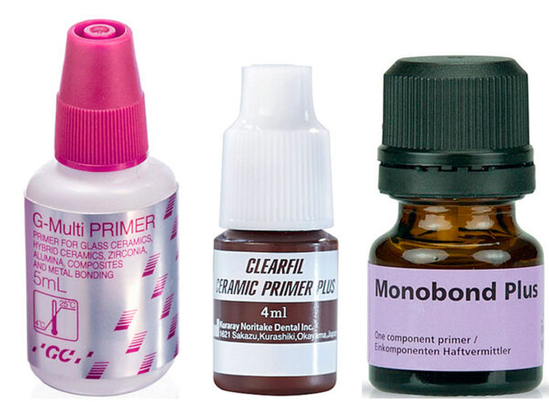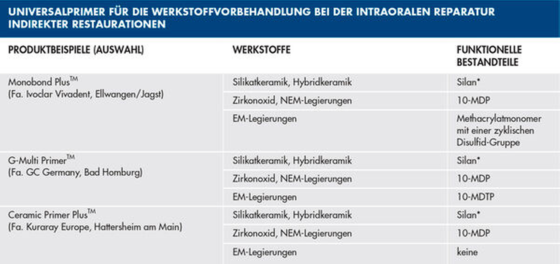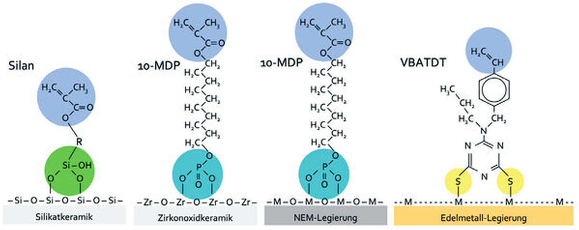 Spezialprimer sind in der Regel jeweils nur für einen bestimmten Werkstoff geeignet (Tabelle 1, Abbildung 10). Eine Ausnahme bilden Primer für Oxidkeramiken, die das Phosphatmonomer 10-MDP enthalten und aufgrund des Bindungsmechanismus von 10-MDP an Metalloxiden auch für die Vorbehandlung von NEM- und Titanlegierungen verwendet werden können. Silikatkeramiken werden nach vorheriger Ätzung mit Flusssäure oder Aufrauhung und Silikatisierung mit einem Silanprimer behandelt. Für die Komposithaftung an Edelmetalllegierungen sorgen Metallprimer, die Monomere mit schwefelhaltigen funktionellen Gruppen (Thioketon- oder Thiol-Gruppen) enthalten. Spezialprimer für hochvernetztes Polymethylmethacrylat (PMMA) basieren auf Methacrylatmonomeren, wie sie auch für Beschichtungen (wie PETIA) und industrielle Klebstoffe (zum Beispiel THFMA) verwendet werden.