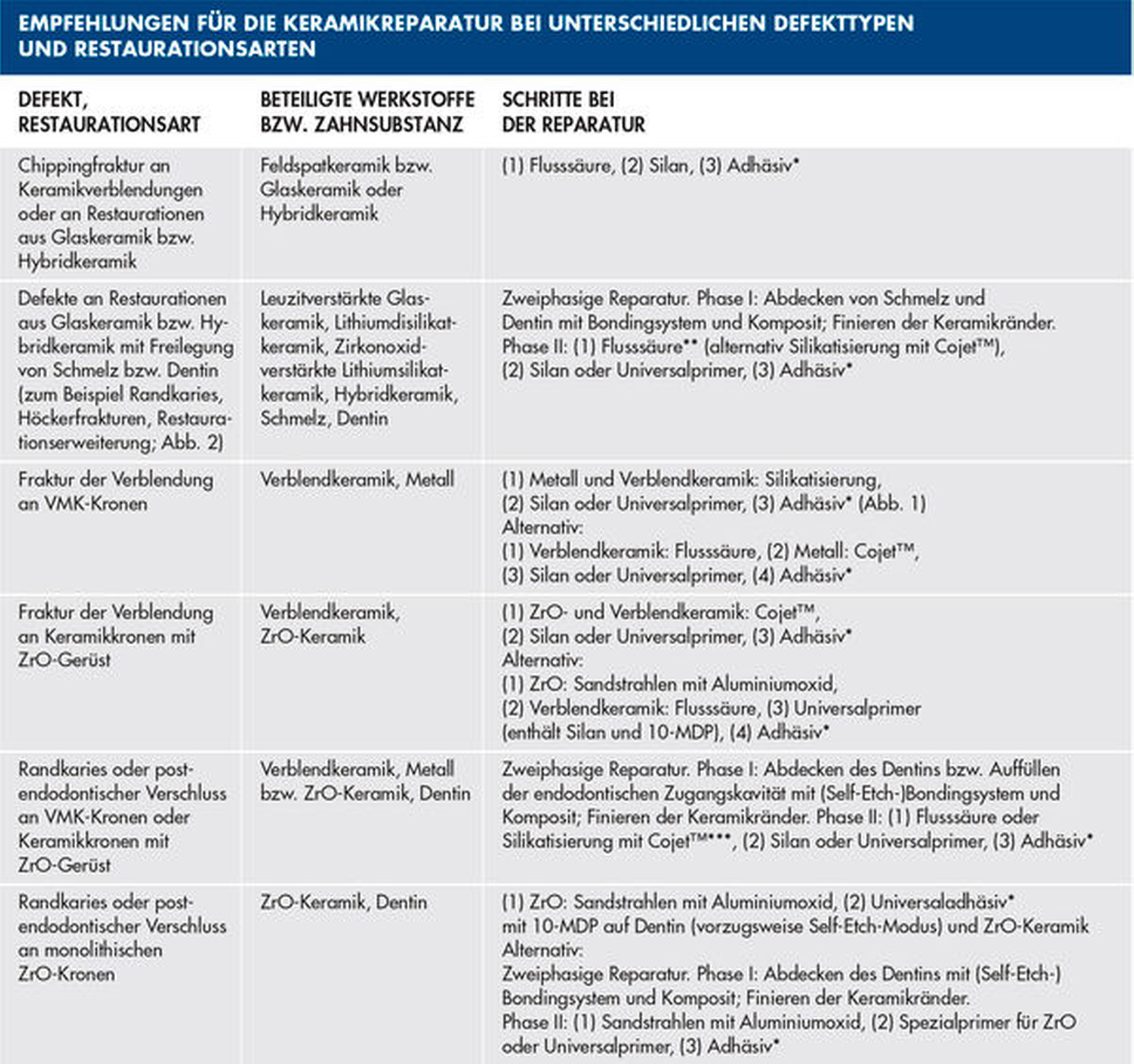 - Die Tabelle „Empfehlungen für die Keramikreparatur bei unterschiedlichen defekttypen Restaurationsarten“ finden Sie hier hochauflösend zum Download. - <link url="https://www.zm-online.de/fileadmin/Reparatur_Tabelle_03.jpg" target="new-window" url-fragment seo-title follow="follow">Zum Download