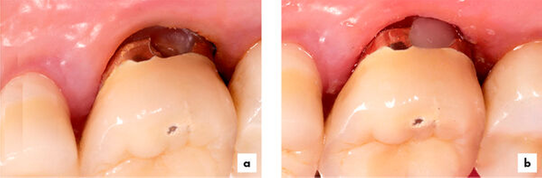 Sekundärkariesläsionen an approximal-zervikalen Restaurationsrändern sind von bukkal oder lingual meist nicht zugänglich. Für eine Reparatur muss in diesem Fall der gesamte approximale Restaurationsteil entfernt werden (Abbildung 8). Damit entsteht eine Situation wie bei approximalen Erweiterungsrestaurationen. Die Teilerhaltung der approximalen Restaurationsfläche ist nur möglich, wenn deren bukko-linguale Ausdehnung groß genug ist und die zervikale Kariesläsion über eine Slot-Präparation zugänglich ist. Eine weitere Reparaturindikation ist der Verschluss endodontischer Zugangskavitäten in Kronen und Teilkronen [Kanzow et al., 2017] (Abbildung 9).