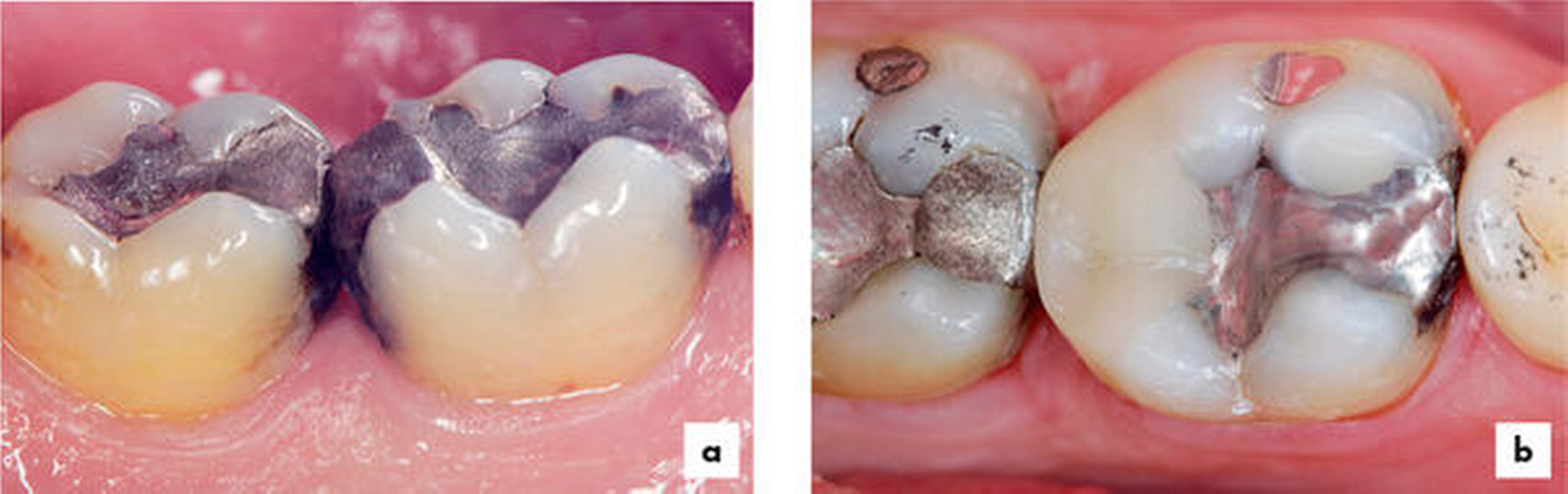 Entsprechende Empfehlungen gelten für die Reparatur von Amalgamfüllungen (Abbildung 18). In bestimmten Situationen kann ein möglichst fester Verbund zwischen dem Reparaturkomposit und der Primärrestauration von Bedeutung sein, zum Beispiel beim Ersatz eines frakturierten Höckers [Özcan und Volpato, 2016]. Auch hier liefert die Vorbehandlung mittels Silikatisierung und Silanisierung ähnliche Haftfestigkeiten wie Sandstrahlen mit Aluminiumoxid und Applikation eines 10-MDP-haltigen Metallprimers [Özcan et al., 2011]. Die Komposithaftung an Amalgam ist allerdings deutlich geringer als die an Komposit [Kanzow et al., 2019]. Zwar lieferte ein Silan- und 10-MDP-haltiges Universaladhäsiv in Kombination mit der Silikatisierung scheinbar gute Haftfestigkeiten, jedoch können diese schlecht eingeordnet werden, da auf wesentliche Kontrollgruppen (separate Silanapplikation vor der Anwendung des Universaladhäsivs; Verwendung eines Metallprimers) verzichtet wurde [Kanzow et al., 2019].