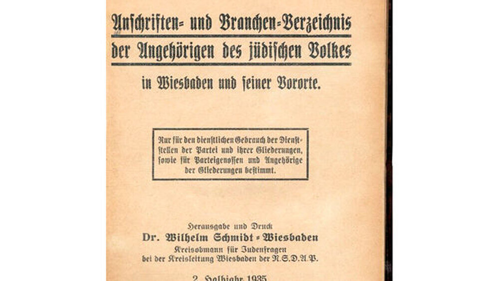 1935 wurde das „Anschriften- und Branchen-Verzeichnis der Angehörigen des jüdischen Volkes in Wiesbaden“ (Abbildung 1) als „Hilfsmittel zu dem Kampf der Wiesbadener Parteigenossen und der Mitglieder der nationalsozialistischen Gliederungen“ herausgegeben und sollte der Verfolgung als jüdisch klassifizierter Bürger und dem Boykott „jüdischer“ Geschäfte dienen. In dieser Hetzschrift war nicht nur Therese Köbig unter der Rubrik „Zahnärzte“ genannt worden, sondern auch ihre Kinder Emil und Klaus als „Halbjuden“ sowie das Geschäft ihres Mannes mit dem Vermerk „Inhaber Emil Köbig ist Arier, Ehefrau Vollblutjüdin“.