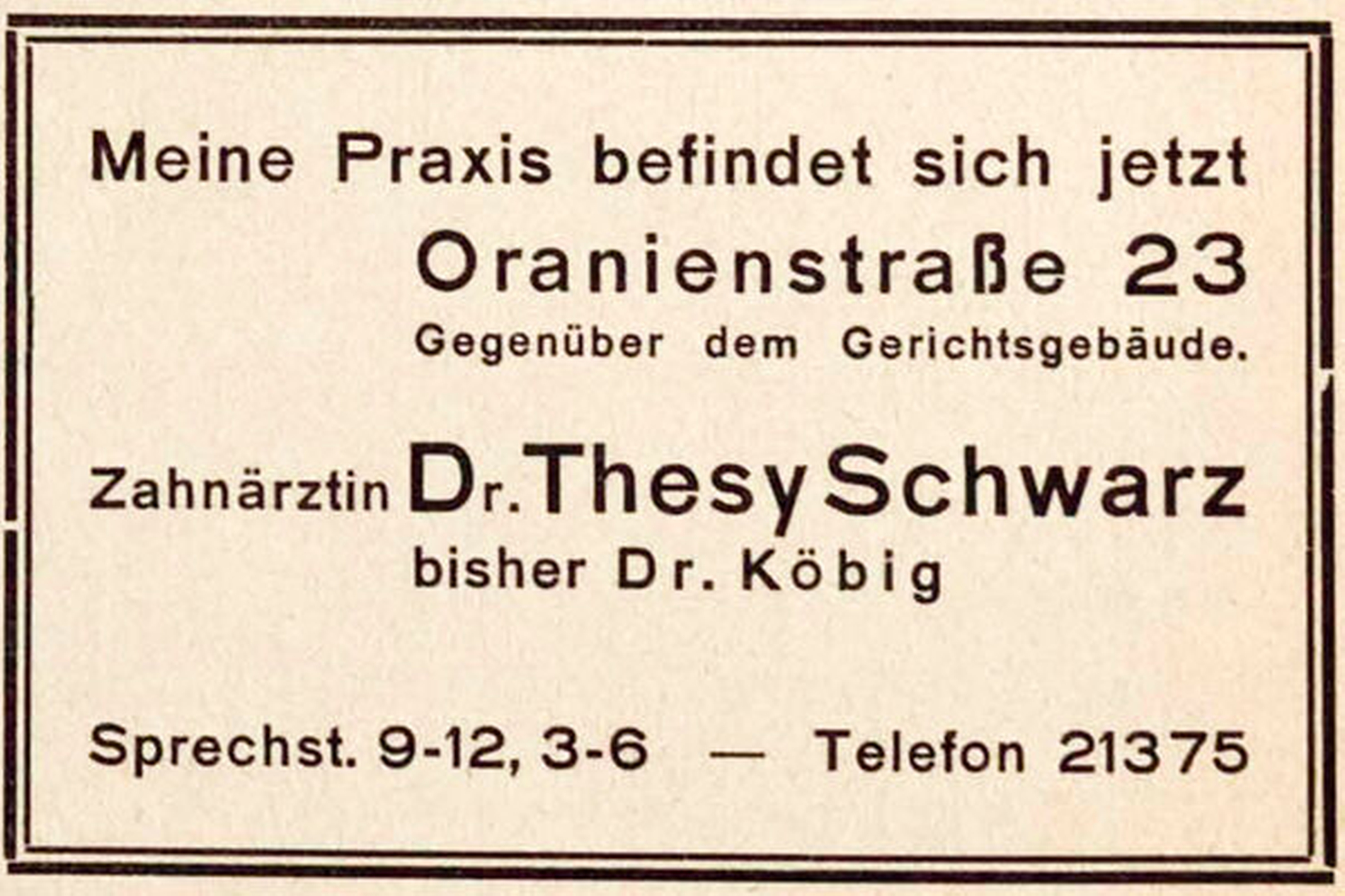 Nach der Scheidung nahm Köbig ihren Geburtsnamen Schwarz wieder an, zog mit ihren Eltern in eine andere, etwa 100 Meter entfernte Wohnung (Oranienstr. 23) und richtete auch dort wieder eine Zahnarztpraxis ein. Ihren Umzug in Wiesbaden annoncierte sie im Februar und März 1937 mehrfach im Mitteilungsblatt der Israelitischen Kultusgemeinde Wiesbaden (Abbildung 2). Nach der Scheidung war sie der Gemeinde wieder beigetreten.