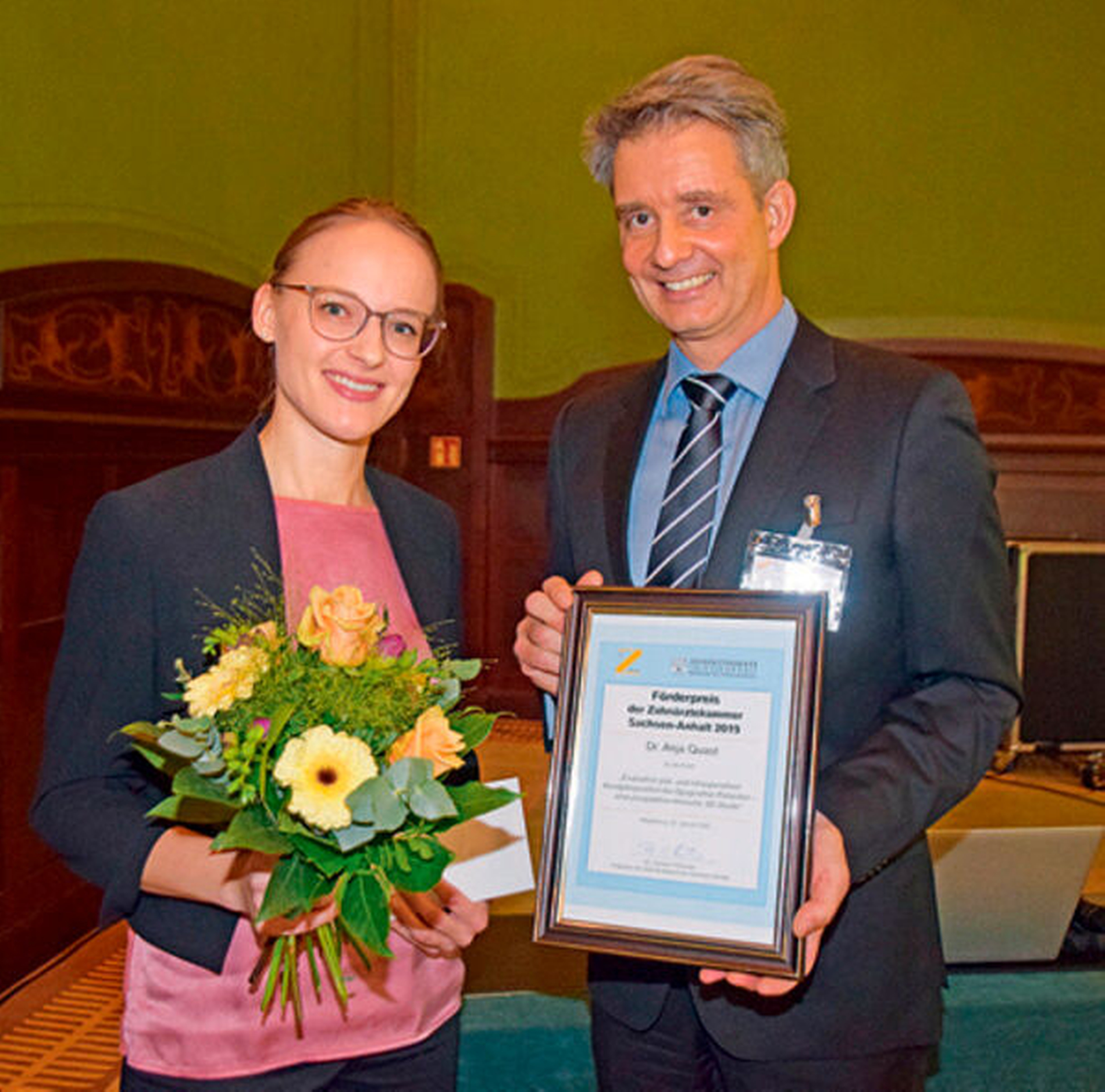 - Die Kieferorthopädin Dr. Anja Quast vom Zentrum für Zahn-, Mund- und Kieferheilkunde der Georg-August Universität Göttingen erhielt den Förderpreis 2019 der Zahnärztekammer. In ihrer Arbeit zur „Evaluation prä- und intraoperativer Kondylenposition bei Dysgnathie-Patienten – eine prospektive klinische 3-D-Studie“ untersuchte sie die zentrische Kondylenposition von Patienten im wachen und im narkotisierten Zustand.