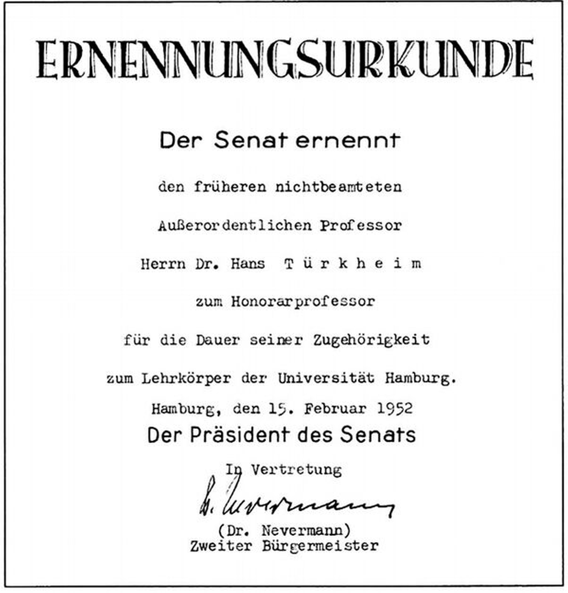 Für Türkheim war zu diesem Zeitpunkt klar, dass er nicht nach Deutschland zurückkehren wollte. Dennoch nahm er 1951 über einen Rechtsanwalt Kontakt zur Universität Hamburg auf, der im Jahr 1952 zu seiner Ernennung zum Honorarprofessor führte (Abbildung 2). Türkheim erklärte: „Wenn die Fakultät bereit ist, mich zu rehabilitieren, bin ich natürlich auch bereit, Vorlesungen zu halten.“32 Dekan Schuchert war Kieferchirurg33 und setzte sich für die Ernennung Türkheims ein. Er führte Unterricht in Blockveranstaltungen bis kurz vor seinem Tod im Jahr 1955 durch34 , ohne jedoch seine Praxis, seine Arbeit in der Continental Dental Society oder seinen Lebensmittelpunkt in London aufzugeben.