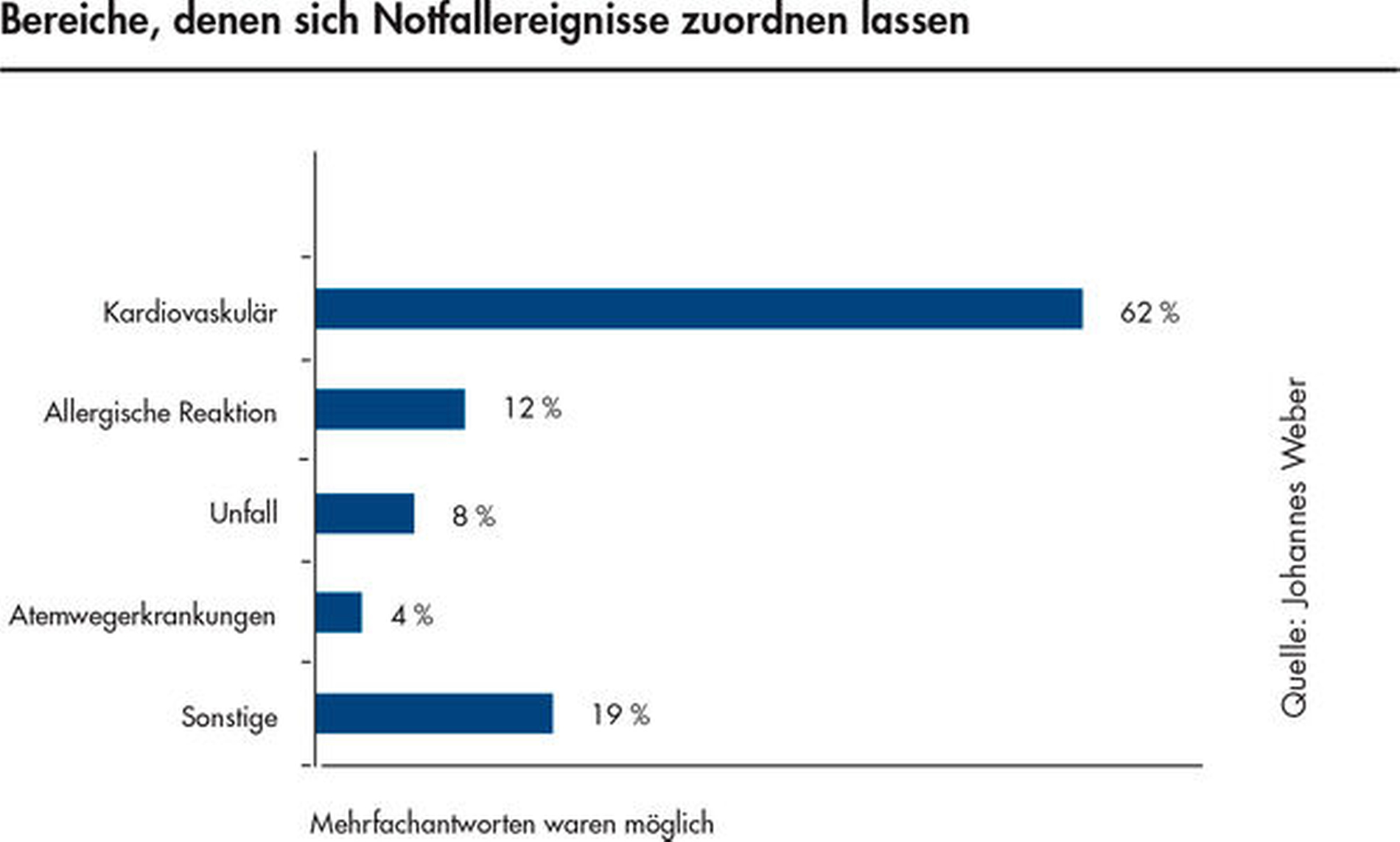 In 92 Prozent der Praxen, die an der Umfrage teilnahmen, findet ein Training auf Notfallereignisse statt, das meist von einem externen Dozenten durchgeführt wird. Mit 62 Prozent sind kardiovaskuläre Symptomatiken die mit Abstand am häufigsten im Notfall auftretenden Komplikationen. Dagegen machen die aufgrund ihrer Schnelligkeit und Unberechenbarkeit gefürchteten allergischen Reaktionen nur 12 Prozent der Ereignisse aus.