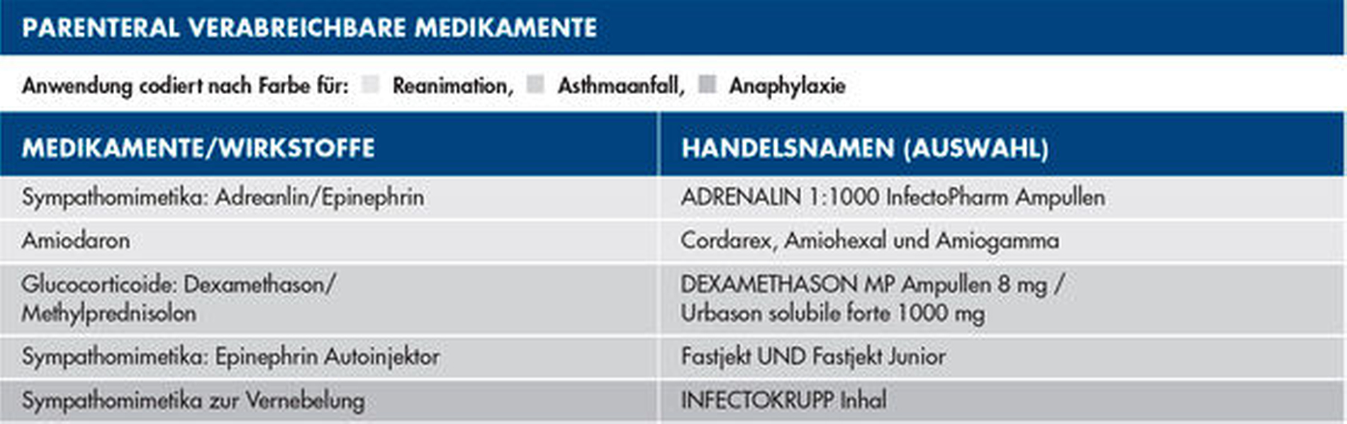 Die empfohlene Zusammenstellung zur Notfallausrüstung ist so konzipiert, dass die Praxis auf alle erwartbaren Notfallsituationen reagieren kann und der Behandler dennoch bei der Vielzahl unterschiedlicher Medikamente und Ausrüstungsgegenstände nicht den Überblick verliert.