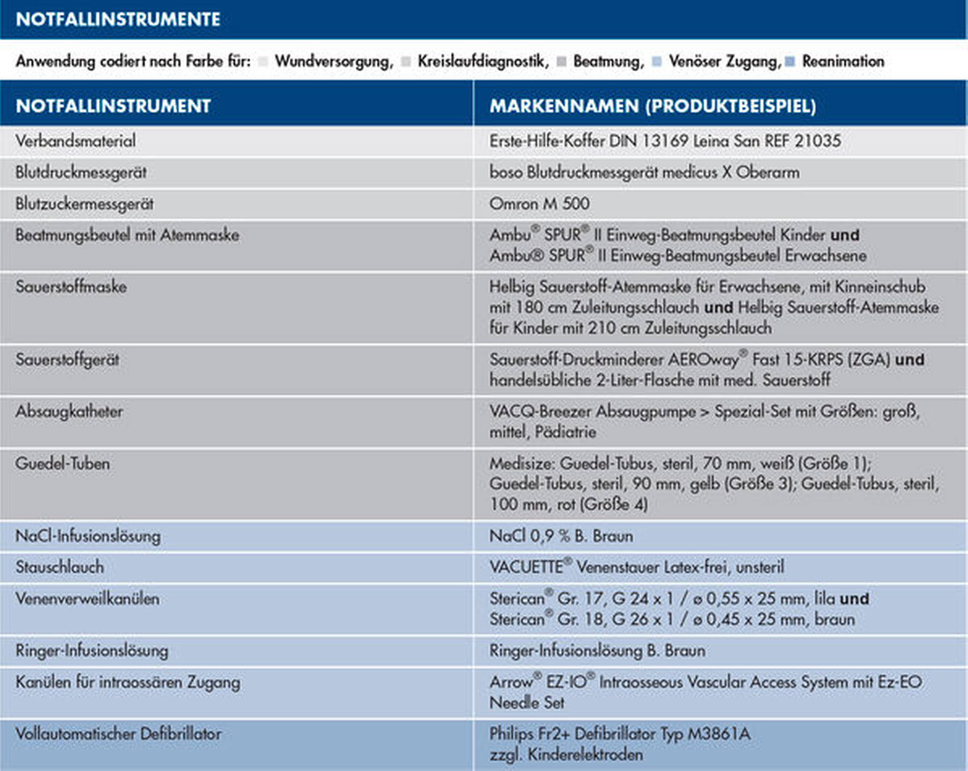 Eine gewisse Sonderrolle nimmt bei den Notfallinstrumenten der Defibrillator ein, denn hier reicht unseres Erachtens auch ein unmittelbarer Zugang etwa durch die Lage der Praxis in einem Ärztehaus aus. Bei den genannten Produkten handelt es sich ausdrücklich um Beispiele, die selbstverständlich durch gleichwertige Produkte anderer Hersteller ersetzt werden können.