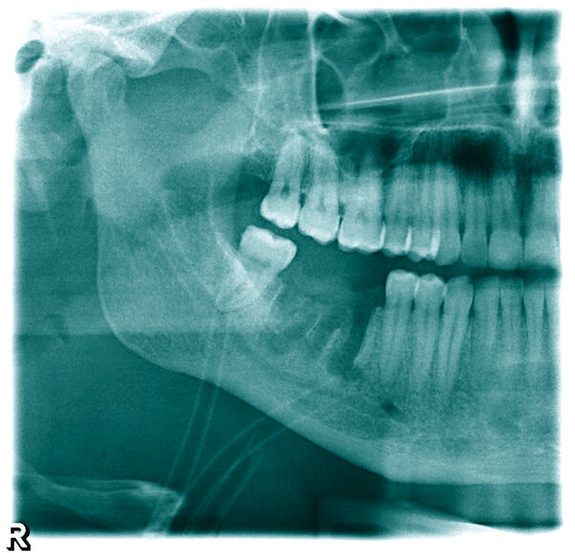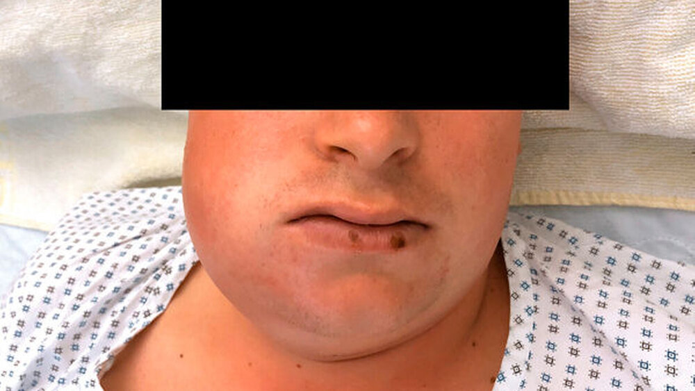 Ein 26-jähriger, osteuropäischer Patient stellte sich mit einer perimandibulären Schwellung des rechten Unterkiefers in der Klinik und Poliklinik für Mund-, Kiefer- und Gesichtschirurgie der Universitätsmedizin Mainz vor. Drei Tage zuvor war die Extraktion der Zähne 46 und 47 durch den Hauszahnarzt erfolgt. Klinisch präsentierte sich der Patient mit starken Schmerzen, einer eingeschränkten Mundöffnung, kloßiger Sprache und Schluckbeschwerden. Der enorale Befund zeigte einen massiven Pusabgang aus den Extraktionsalveolen 46 und 47. Extraoral war der Unterkieferrand nicht mehr durchtastbar, so dass in der Zusammenschau der Befunde von einem perimandibulären Abszess auszugehen war (Abbildung 1).