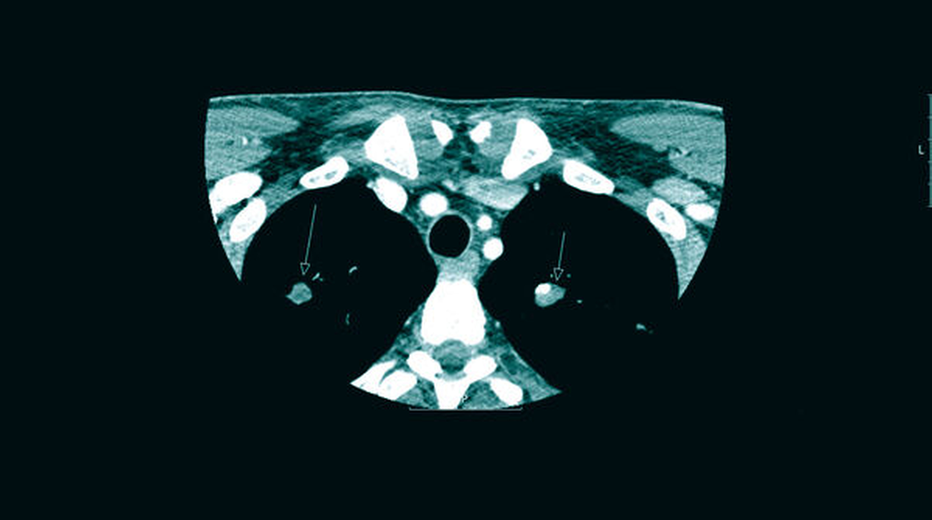 Die postoperative Bildgebung (Halbseiten-OPTG) zeigt die Extraktionsalveolen 46 und 47 ohne Anhalt auf Wurzel- oder Materialreste ebenso wie die eingelegten Drainageröhrchen (Abbildung 2). Während des postoperativen Heilungsverlaufs war die Schwellung nur langsam regredient und der Abgang putriden Sekrets über die extraorale Wunde weiterhin stark, so dass eine Computertomografie (CT) des Halses zum Ausschluss eines Wurzelrests, einer Fraktur oder einer Ausbreitung durchgeführt wurde. In dieser fielen nebenbefundlich circa 10 mm messende Verdichtungen in beiden Lungenoberlappen im Sinne punktuell verkalkter Kavernen auf (Abbildung 3).