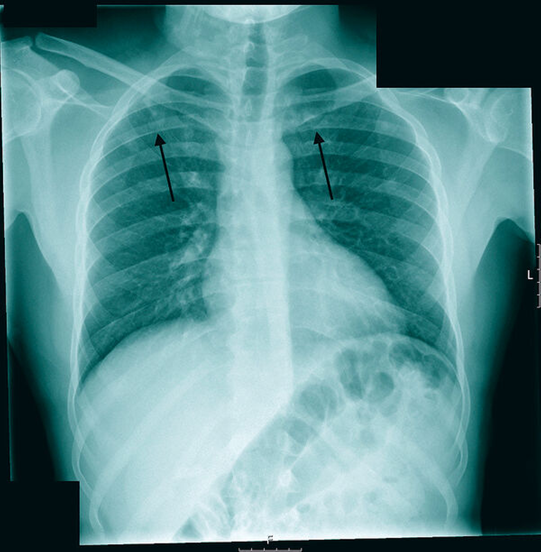 Bei Verdacht auf eine Lungentuberkulose wurden ein Interferon-Gamma-Test (Quantiferon) und eine Röntgenaufnahme des Thorax durchgeführt. In der Röntgenaufnahme zeigten sich korrespondierend zur CT Rundherde und kleinfleckige Infiltrate in den Lungenoberfeldern beidseits mit zentraler Einschmelzung des Herdes im rechten Oberfeld (Abbildung 4). Bei Vorliegen eines positiven Interferon-Gamma-Testergebnisses wurden entsprechend den Empfehlungen zum Ausschluss einer offenen Lungentuberkulose an drei aufeinanderfolgenden Tagen Sputumproben des Patienten entnommen und mikroskopisch mittels Ziehl-Neelsen-Färbung untersucht. Darin zeigte sich vorerst kein Nachweis säurefester Stäbchen, wohingegen in der angefertigten Kultur nach 21 Tagen ein Wachstum von Mycobacterium tuberculosis nachgewiesen werden konnte. Die Serologie des Patienten auf HIV war negativ. Die namentliche Meldung des Patienten und aller Kontaktpersonen erfolgte entsprechend dem Infektionsschutzgesetz an die zuständige Behörde. Es wurde eine sofortige Vierfachtherapie mit den Erstlinienmedikamenten Rifampizin, Pyrizinamid, Insoniazid und Ethambutol eingeleitet und über eine Dauer von zwei Monaten beibehalten. Danach folgte die Kontinuitätsphase über weitere vier Monate mit Isoniazid und Rifampizin.
