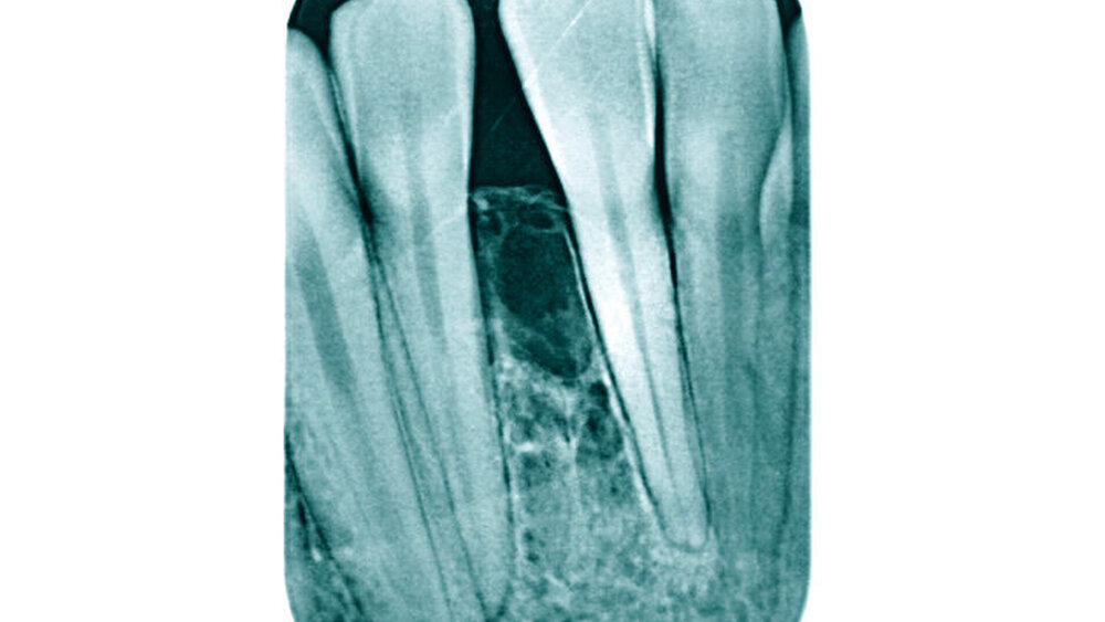 Die Patientin war zum Zeitpunkt ihrer Erstvorstellung schmerzfrei. Die Zähne 41 und 42 stellten sich vital dar und reagierten unauffällig auf Perkussion und Palpation. Klinisch imponierte eine interdentale Schwellung. Überdies bestand zwischen 41 und 42 eine Lücke, die anamnestisch früher nicht vorgelegen habe. Auf dem bereits alio loco angefertigten Zahnfilm (Abbildung 1) waren interdental befindliche, multilokuläre, unscharf begrenzte Transluzenzen zu erkennen. Aufgrund des verdrängenden Wachstums fiel die gemeinsame Entscheidung für eine Resektion der Raumforderung mit Erhalt der benachbarten Zähne. Auf eine dreidimensionale Bildgebung wurde aufgrund des eindeutigen klinischen Bildes und der relativ kleinen radiologischen Transluzenz verzichtet.
