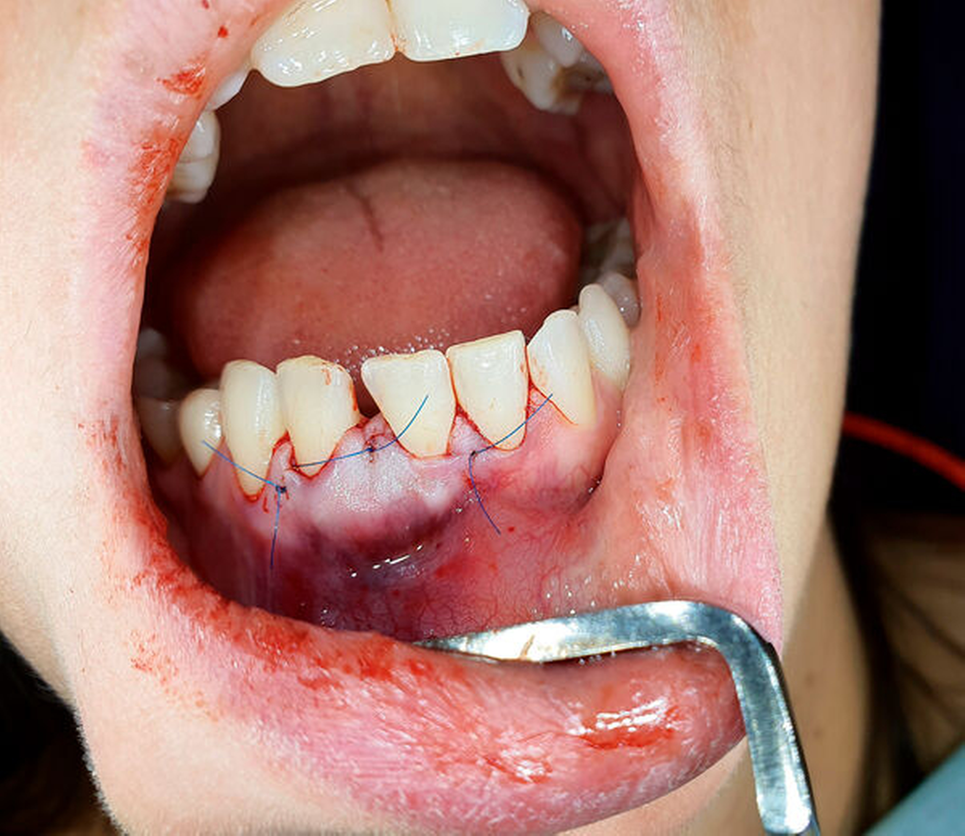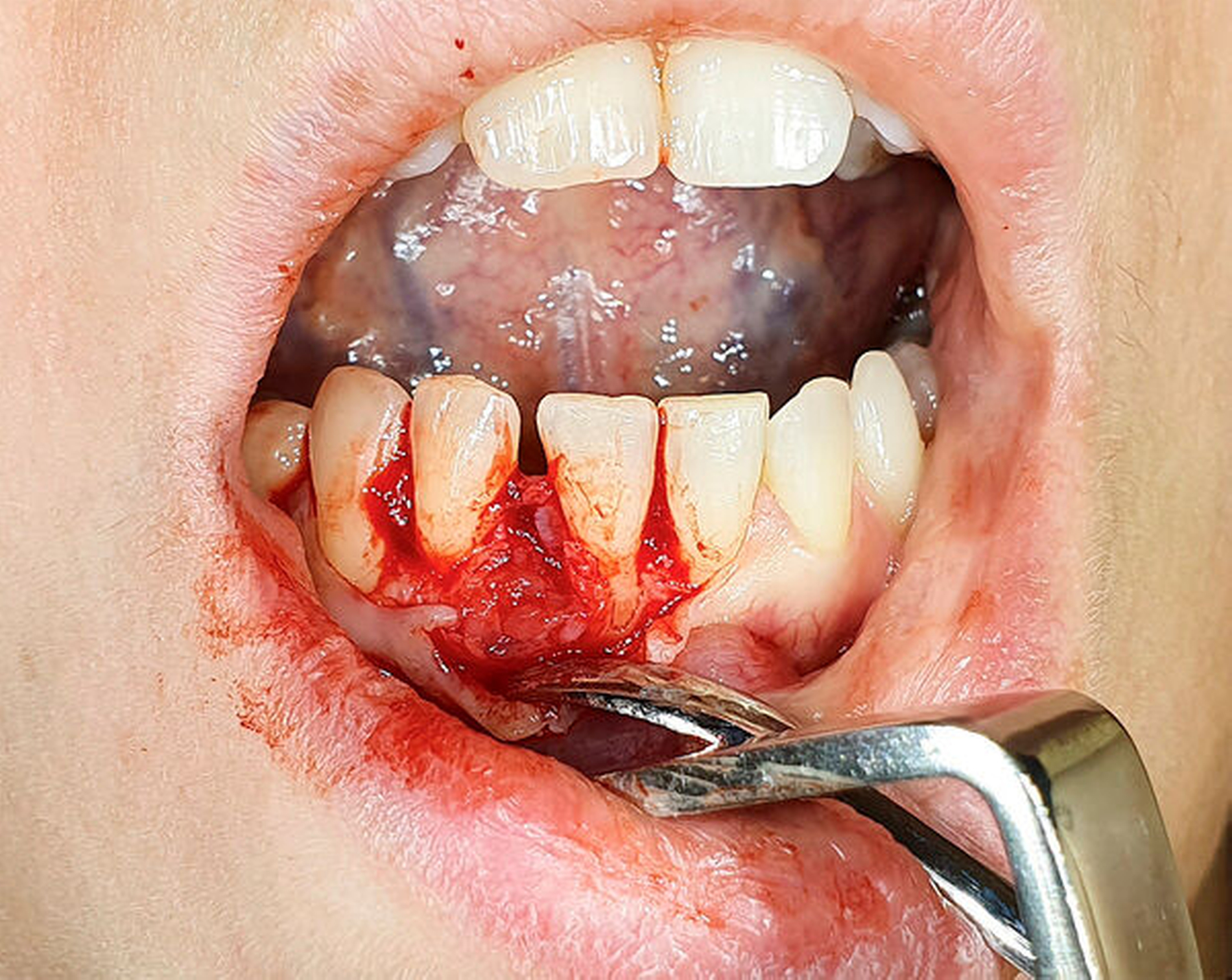 Anschließend wurden der umliegende Knochen und die freiliegenden Wurzelflächen der Zähne 41 und 42 kürettiert (Abbildung 4) und die entstandene Knochenkavität wurde mittels autologem Thrombozytenkonzentrat (Platelet Rich Fribrin – PRF) aufgefüllt.