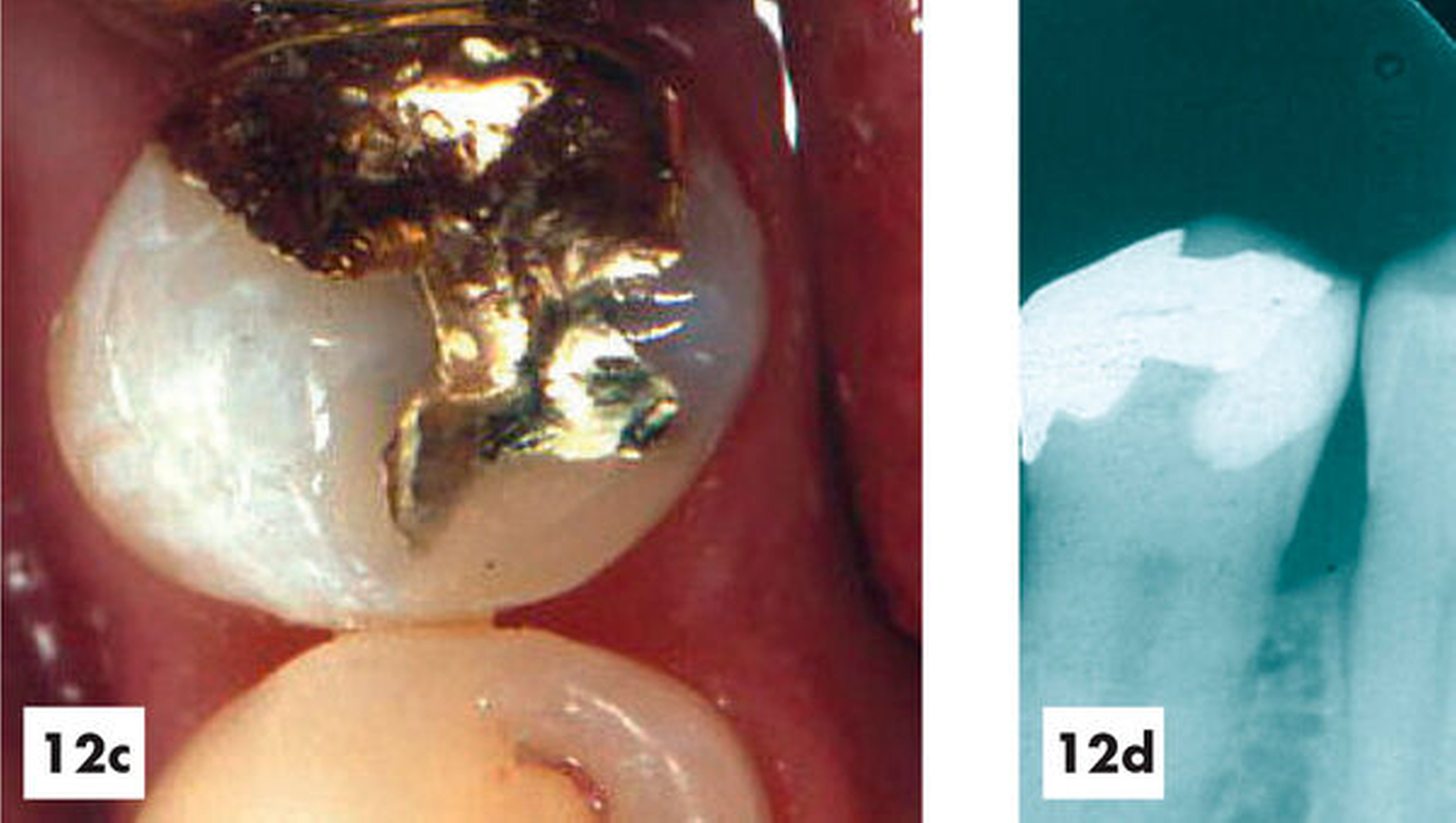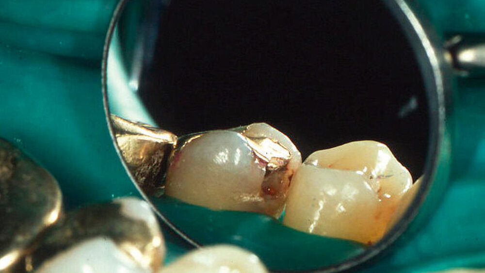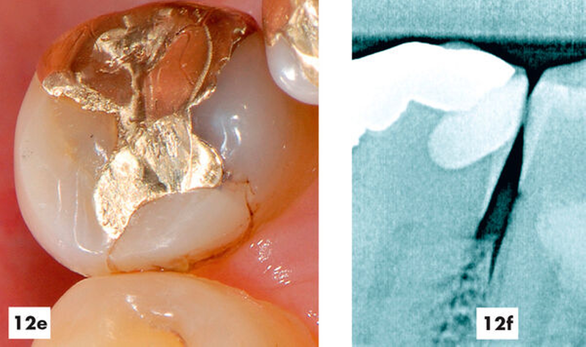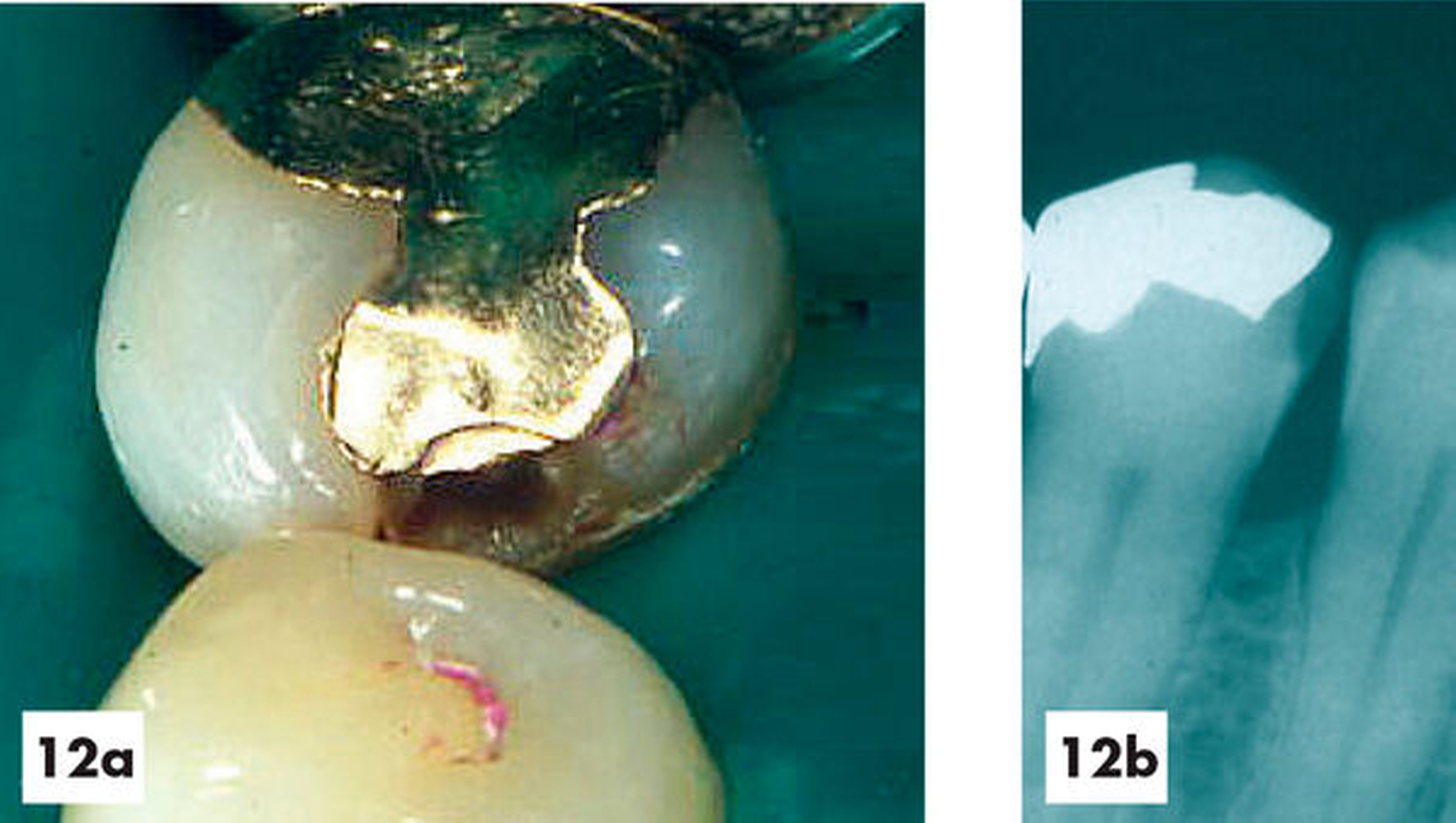 Gussmetallrestaurationen zählen nach wie vor zu den langlebigsten Versorgungen, die wir kennen. Aber auch hier kann es zu Abplatzungen, Perforationen oder Randkaries kommen. In den Abbildungen 10 bis 12 wird ein 54-jähriger Patient mit einem etwa 25 Jahre alten Gusmetall-Inlay vorgestellt, an dessen Rand ein kariöser Defekt eingetreten war. Die daraufhin eingebrachte Reparaturrestauration erfüllt seit inzwischen 22 Jahren ihren Zweck, so dass die Gesamtüberlebenszeit momentan bei fast 50 Jahren liegt.