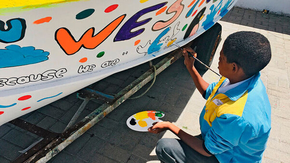 Erstmals ist auch der Berliner Künstler Ali Görmez unter den Ehrenamtlichen. Für ihn bedeutet das künstlerische Gestalten von Dingen zusammen mit Kindern nicht nur Spaß, sondern auch Therapie. Durch seine fachkundige Begleitung möchte er die kreativen Fähigkeiten und sinnliche Wahrnehmung bei Kindern fördern. Zusammen mit den Schulkindern bemalt er ein veraltetes Fischerboot auf dem Kirchenhof, während wir drinnen die kaputten Zähne reparieren.