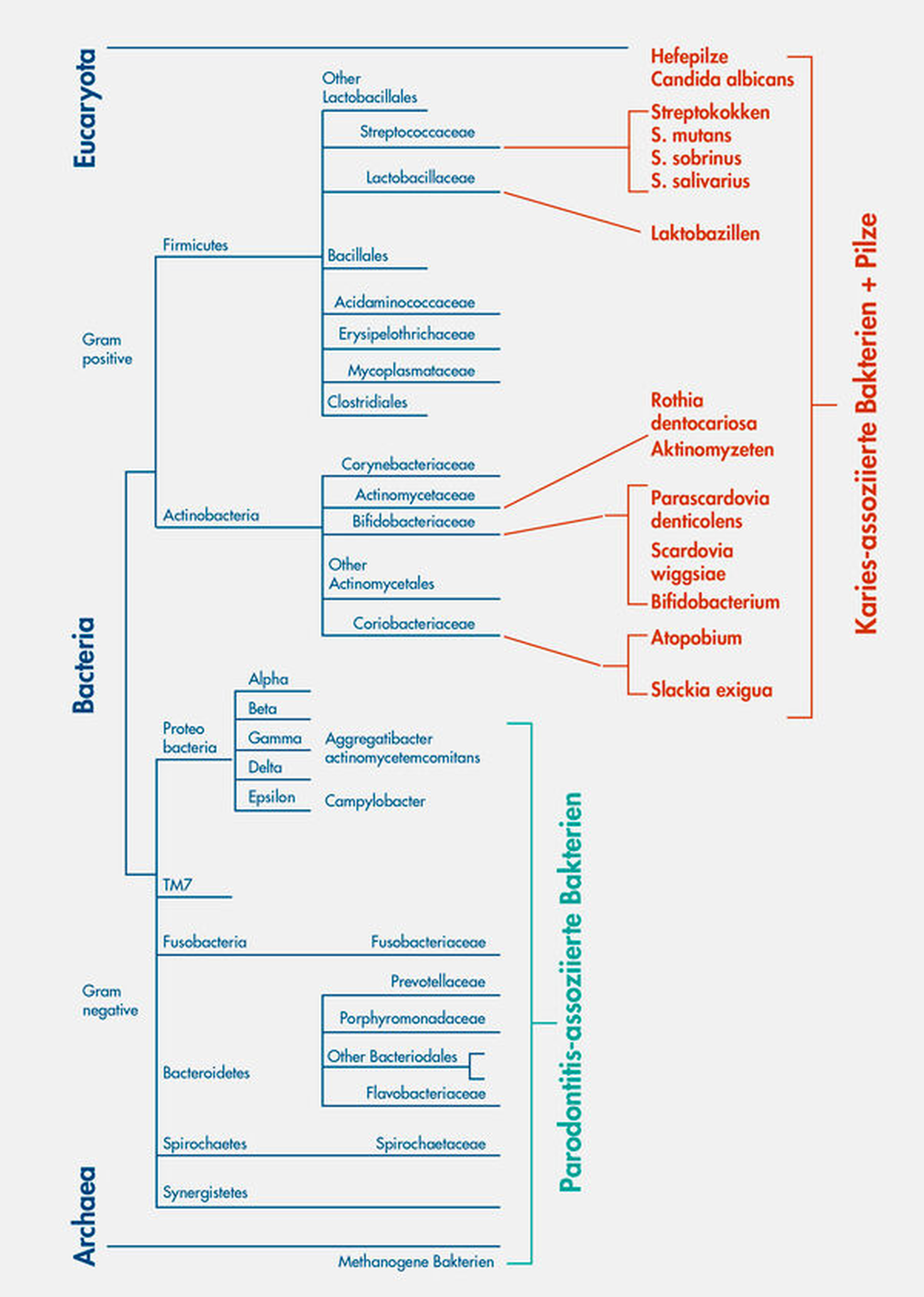 Die gegensätzlichen Eigenschaften des mikrobiellen Einflusses auf die Entstehung von Karies (Zuckerabbau, supragingivale Lage, leicht aerob bis anaerob) und Parodontitis (Proteinabbau, subgingivale Lage, anaerob) spiegeln sich interessanterweise in der phylogenetischen Herkunft der Erreger wider: Karies ist eher mit gram-positiven Bakterien und eukaryotischen Hefen der oberen Stammbaumhälfte assoziiert, während Parodontitis eher mit gram-negativen Bakterien und methanogenen Archaeen der unteren Stammbaumhälfte assoziiert ist.