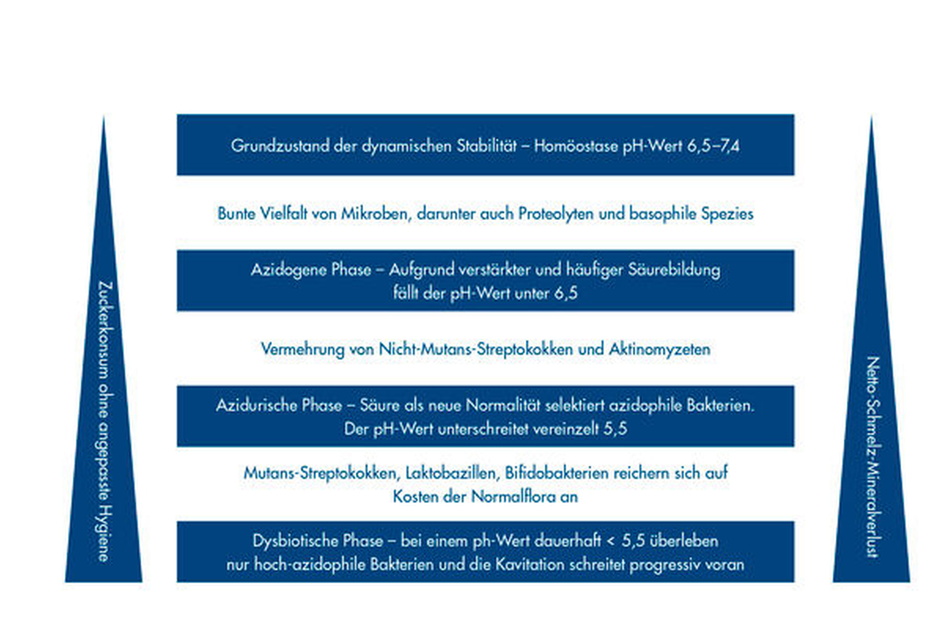 Die Mundflora besteht aus acht häufigen (Anteil > 1 Prozent aller Spezies und Taxa) und sehr vielen seltenen Bakteriengruppen, die wir Phyla nennen. Ein Phylum besteht aus mehreren Ordnungen, die aus mehreren Familien, die aus mehreren Gattungen, die aus mehreren Arten und schließlich aus mehreren Stämmen und unzähligen Isolaten bestehen. Für die Kariogenese kann man seine Betrachtung auf zwei bis drei Phyla (Firmicutes, Proteobakterien, Aktinobakterien) beschränken, was aber zusammen genommen 500 Arten sind, die etwa 65 Prozent der Mundflora ausmachen. Hinzu kommen noch die gärenden Hefepilze, wenn wir das prinzipielle kariogene Potenzial bewerten wollen. Damit sollte klar sein, dass wir eine säurefreie Mundhöhle niemals erreichen können. Eliminiert man einige der Top-Zuckerfermenter (Saccharolyten), so werden andere schnell diese Nische besetzen.