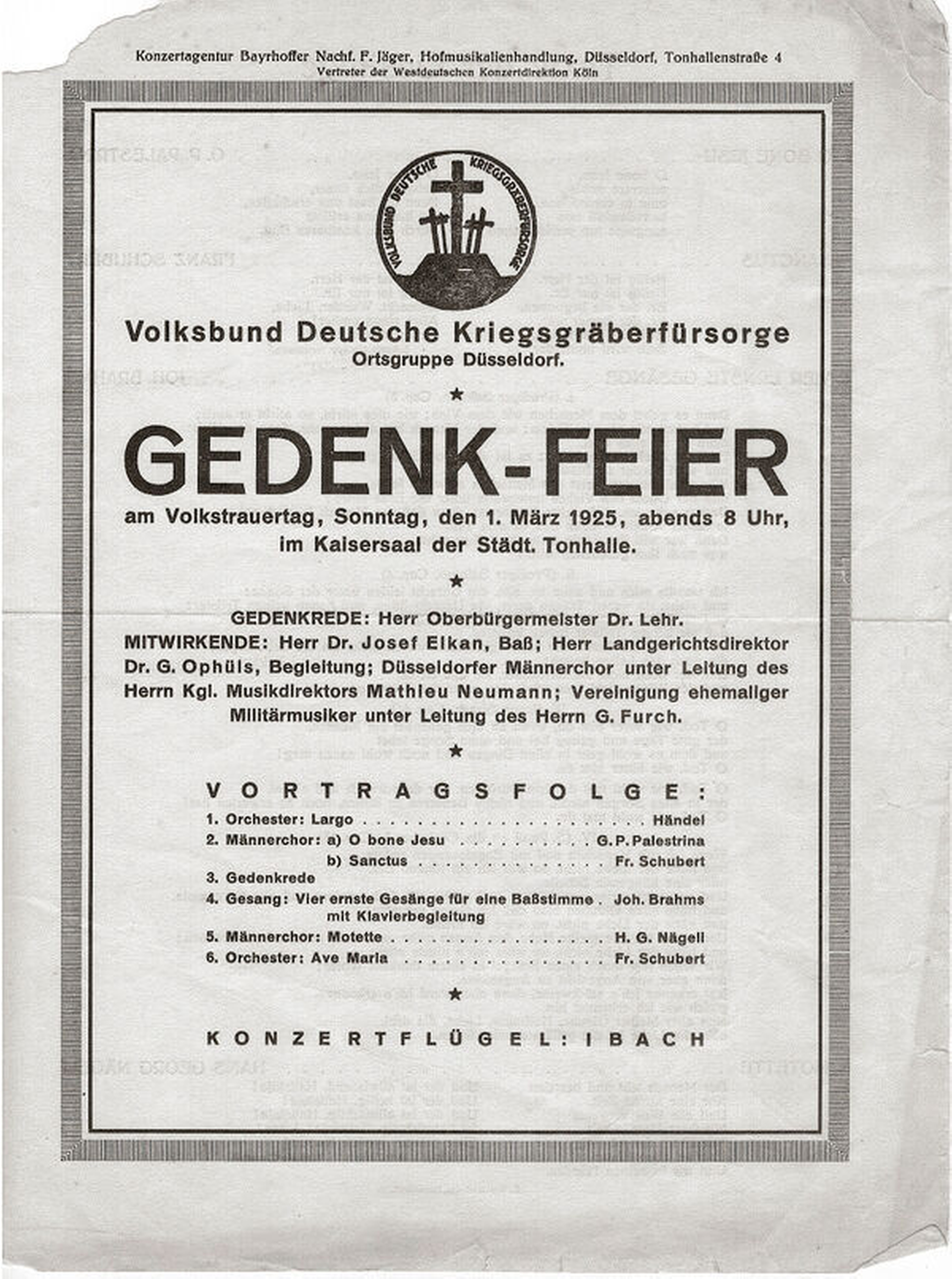 Vor der Machtübernahme der Nationalsozialisten war Elkan in Düsseldorf auch musisch aktiv. Von seinem Talent als Sänger hatte er schon im Feldlazarett „zur Freude der Truppen“ gern Gebrauch gemacht.24 Zum Volkstrauertag 1925 trat er in einer Gedenkfeier in der Städtischen Tonhalle als Solist auf (Abbildung 2). Ebenso war er Teil des Ensembles des Städtischen Musikvereins, das die Matthäus-Passion von J.S. Bach aufführte.25 Sogar in einem Nachschlagewerk zu verfolgten jüdischen Musikern ist Elkan verzeichnet.26