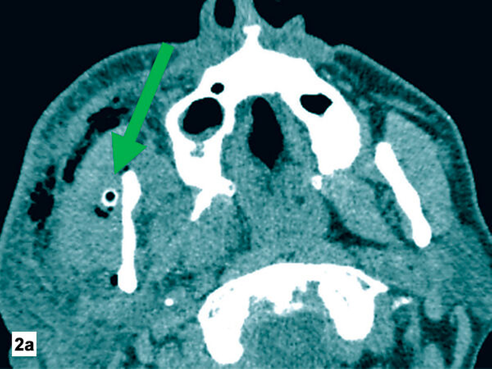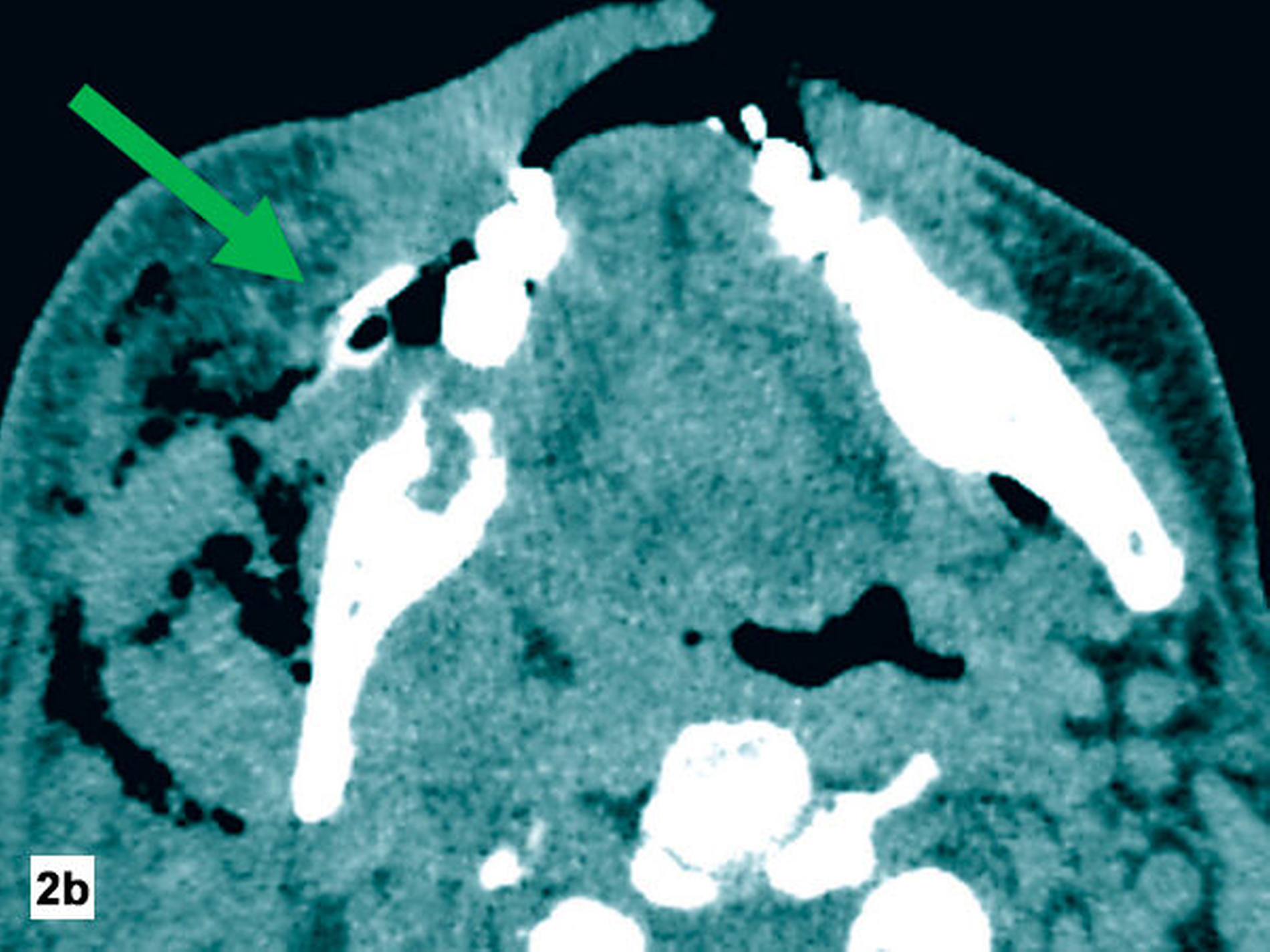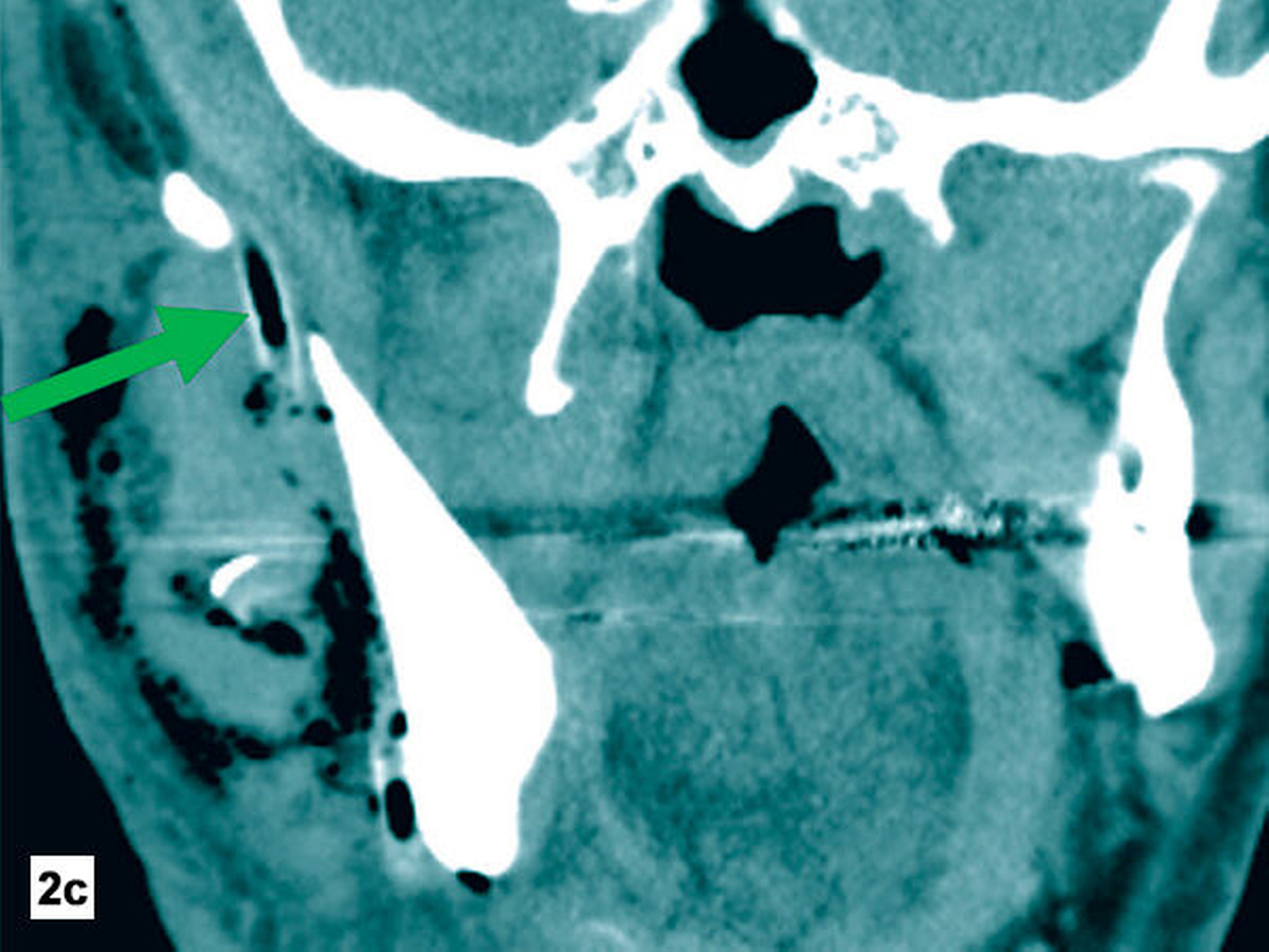 Am Folgetag zeigte der Patient eine zunehmende Verschlechterung und eine progrediente Schwellung der Halsregion mit beginnender Luftnot. Zur erweiterten Diagnostik wurde eine Computertomografie (CT) der Kopf-Hals-Region durchgeführt (Abbildung 2). Hier zeigten sich ein Flüssigkeitsverhalt submandibulär rechts trotz loco typico einliegender Drainage sowie Gewebseinschmelzungen und Gasblasen entlang des rechtsseitig-zervikalen und temporalen Faszienverlaufs.