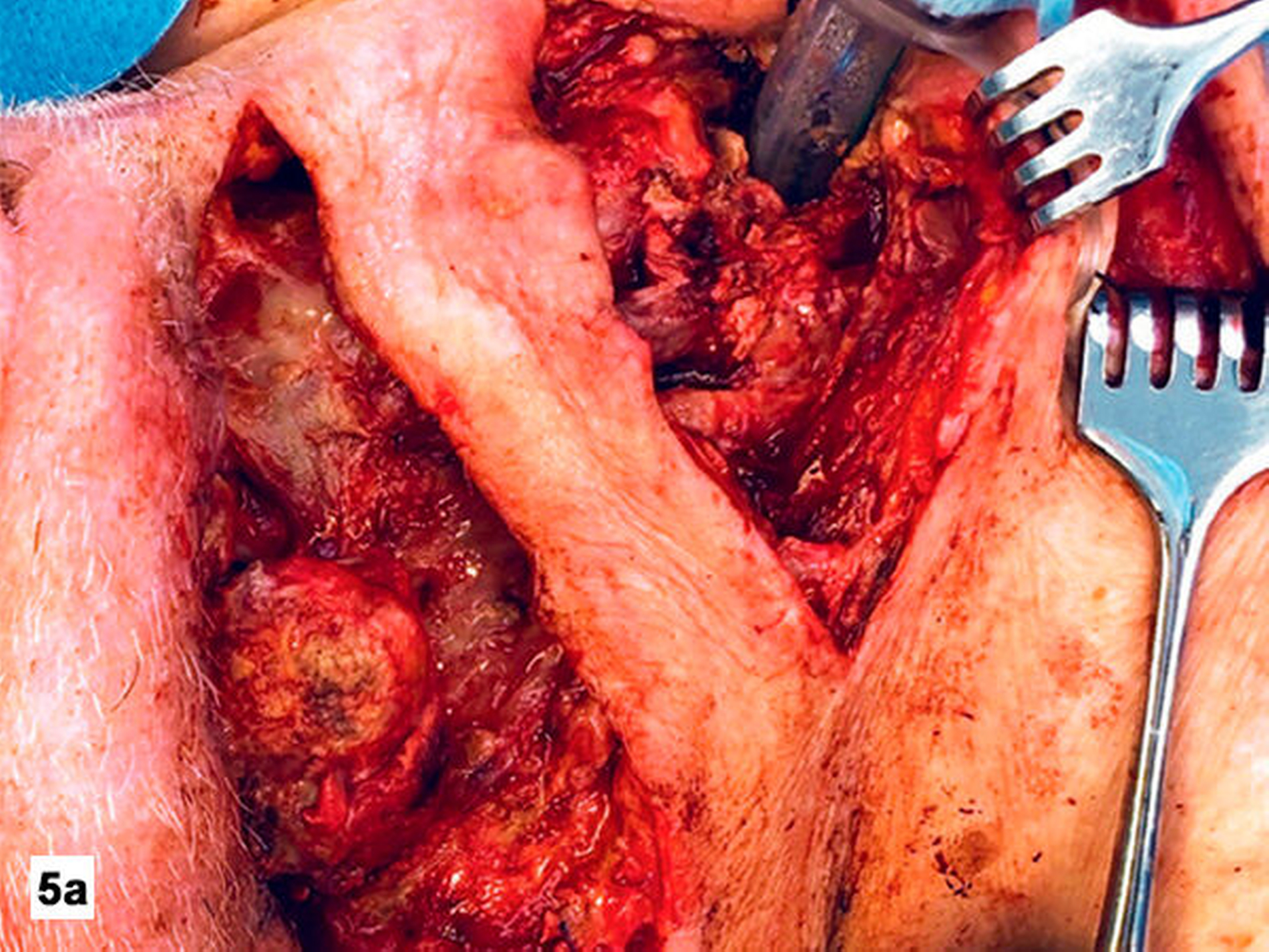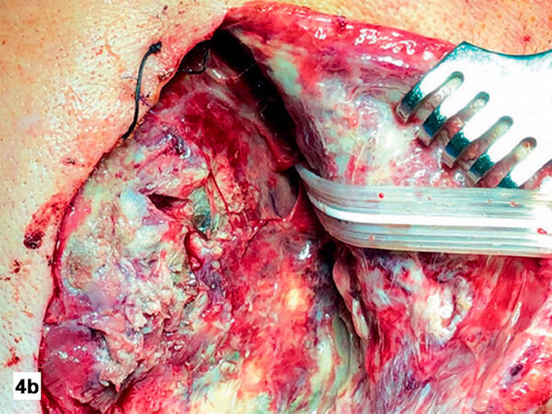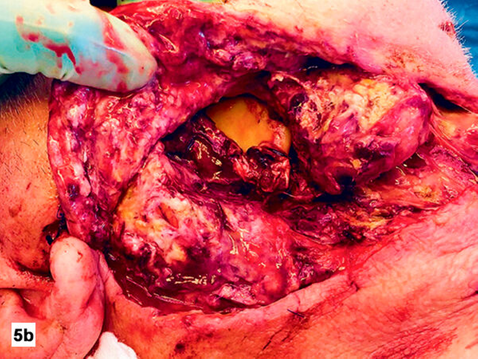 Es erfolgte eine unmittelbare notfallmäßige chirurgische Exploration. Hierbei zeigte sich eine klinisch manifeste Myonekrose der submandibulären, der perimandibulären und der temporalen Kompartimente (Abbildung 3). Die nekrotischen Bereiche wurden entfernt und eine großflächige Lavage mit Polyhexanid-Lösung wurde durchgeführt. Zur Atemwegssicherung wurde der Patient tracheotomiert. Intraoperativ kam es zunehmend zu einer kardiopulmonalen Instabilität, so dass der Patient postoperativ mit septischen Parametern zur weiteren Überwachung auf die Intensivstation verlegt wurde.