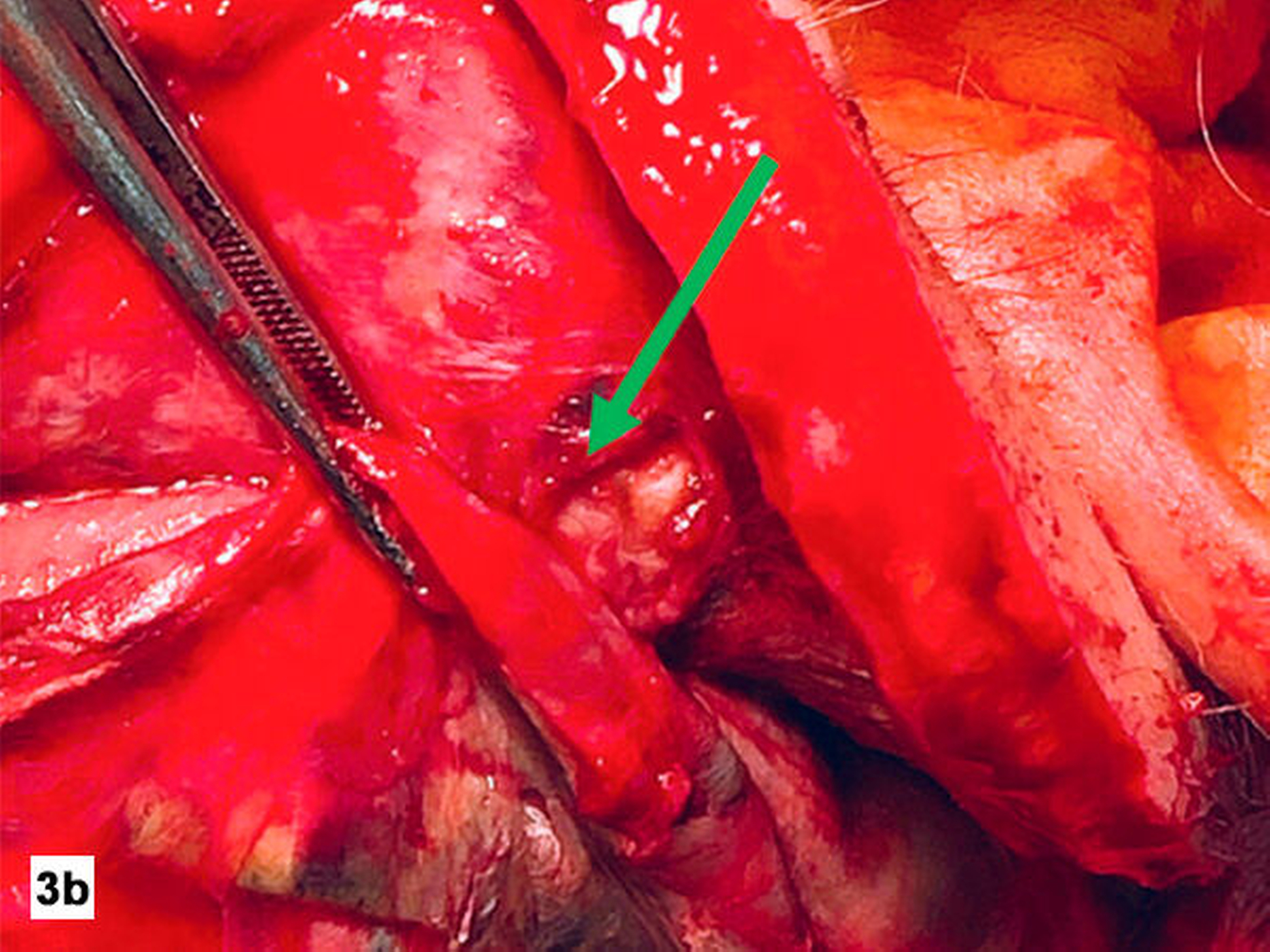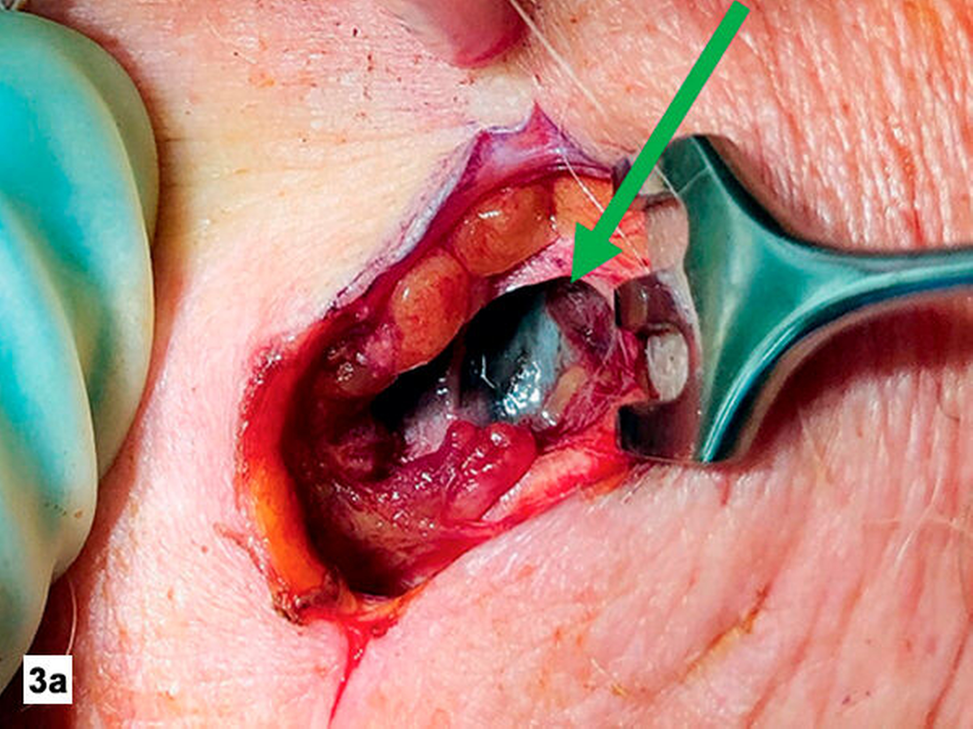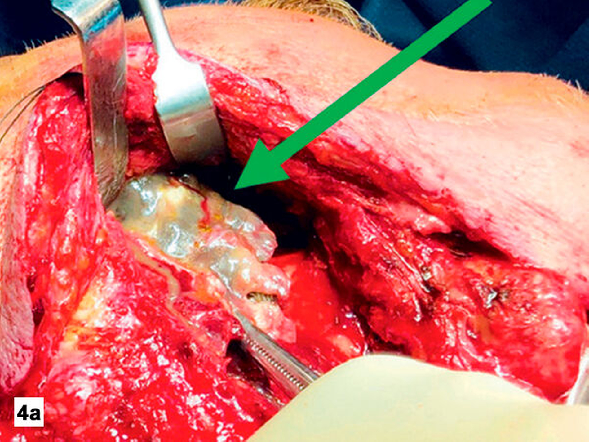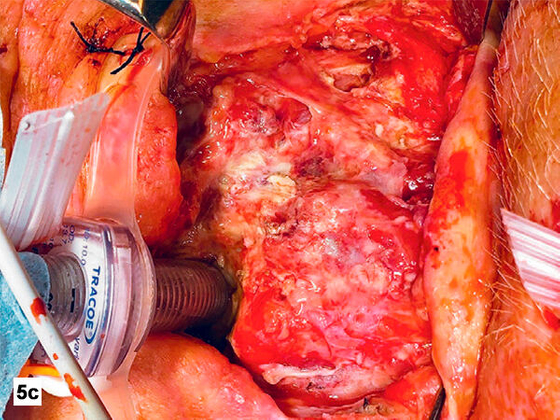 Es erfolgte eine unmittelbare notfallmäßige chirurgische Exploration. Hierbei zeigte sich eine klinisch manifeste Myonekrose der submandibulären, der perimandibulären und der temporalen Kompartimente (Abbildung 3). Die nekrotischen Bereiche wurden entfernt und eine großflächige Lavage mit Polyhexanid-Lösung wurde durchgeführt. Zur Atemwegssicherung wurde der Patient tracheotomiert. Intraoperativ kam es zunehmend zu einer kardiopulmonalen Instabilität, so dass der Patient postoperativ mit septischen Parametern zur weiteren Überwachung auf die Intensivstation verlegt wurde.