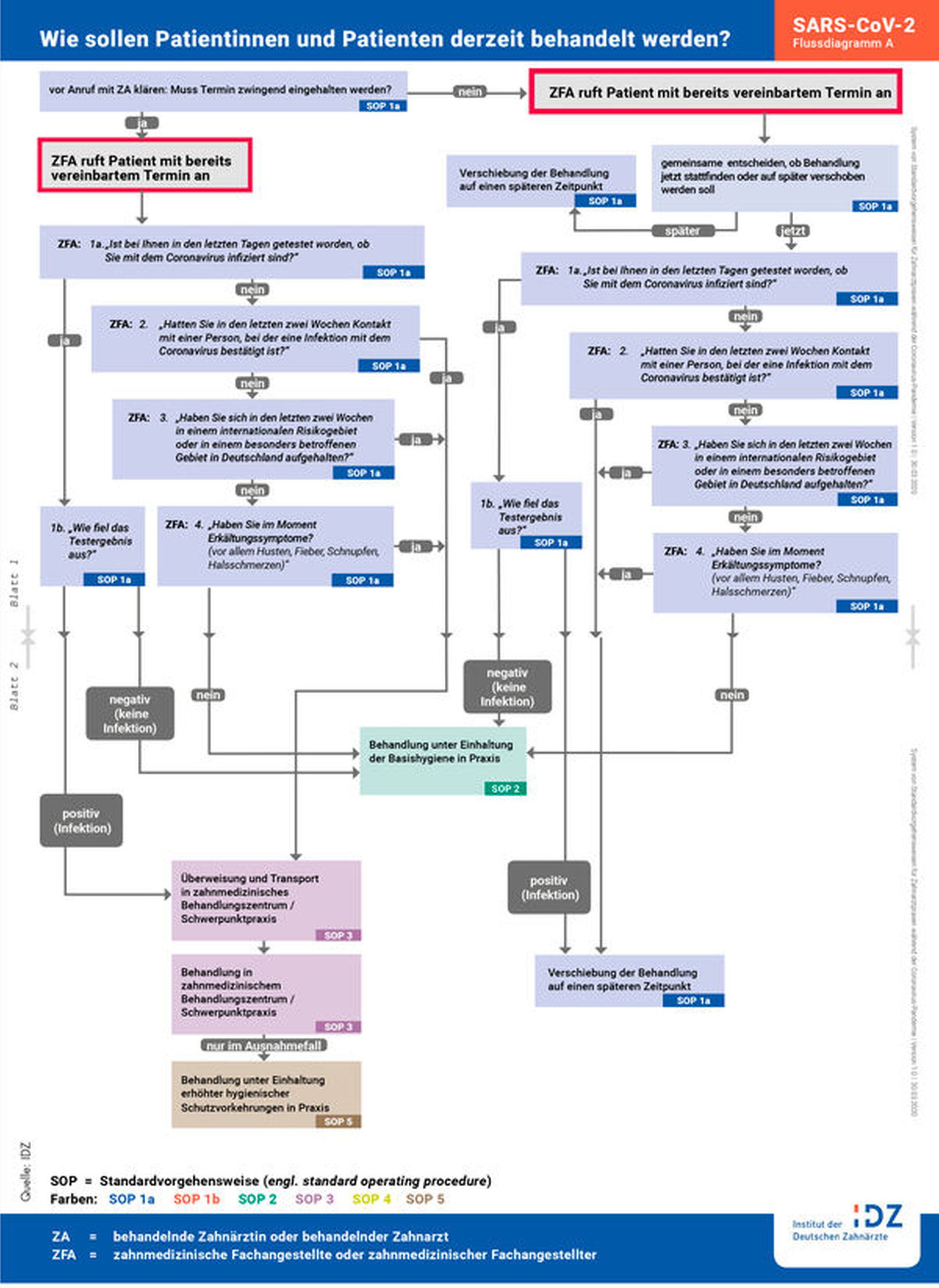 Das Grundkonzept sieht vor, dass bei jedem Patienten zunächst gründlich überprüft wird, ob eine zahnmedizinische Behandlung unverzüglich erfolgen muss und ob eventuell eine Coronavirus-Infektion oder ein Verdacht auf eine Infektion vorliegt. Aus diesen Informationen ergibt sich dann unmittelbar das weitere Vorgehen für die Zahnarztpraxen.