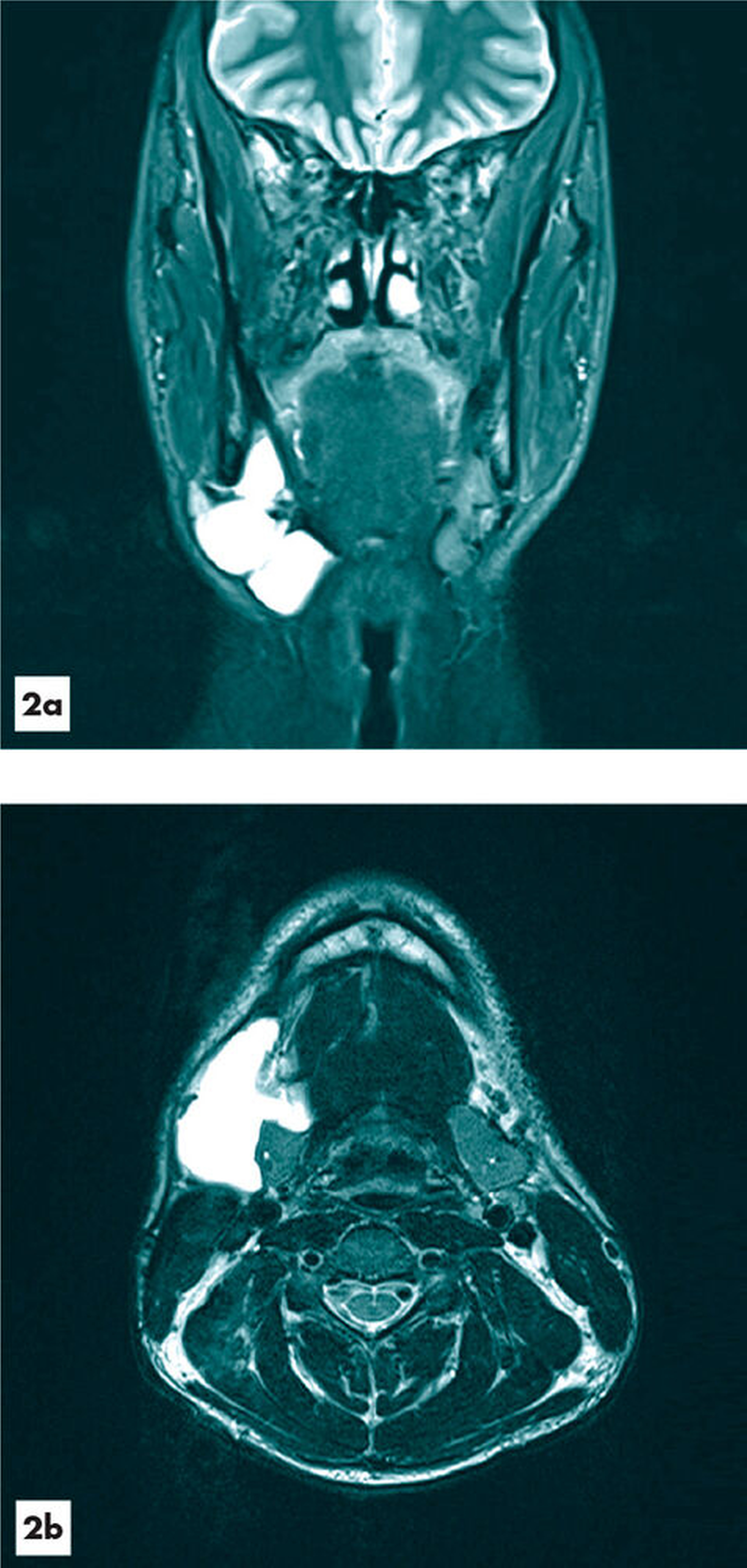 Im Jahr 2016 suchte der Patient einen niedergelassenen HNO-Kollegen wegen Schmerzen im Bereich der zervikalen Schwellung und eines neu aufgetretenen Lagerungsschwindels auf. Bei der daraufhin veranlassten MRT-Untersuchung wurde von radiologischer Seite erstmals der Verdacht auf eine Tauchranula geäußert (Abbildung 2). Jedoch wurden diesbezüglich keine weiteren Therapieschritte unternommen. Aufgrund der Persistenz der Schwellung suchte der Patient in der Folgezeit mehrere Kliniken auf, wobei die klinischen, sonografischen und radiologischen Befunde zunächst für das Vorliegen einer lymphatischen Malformation sprachen.