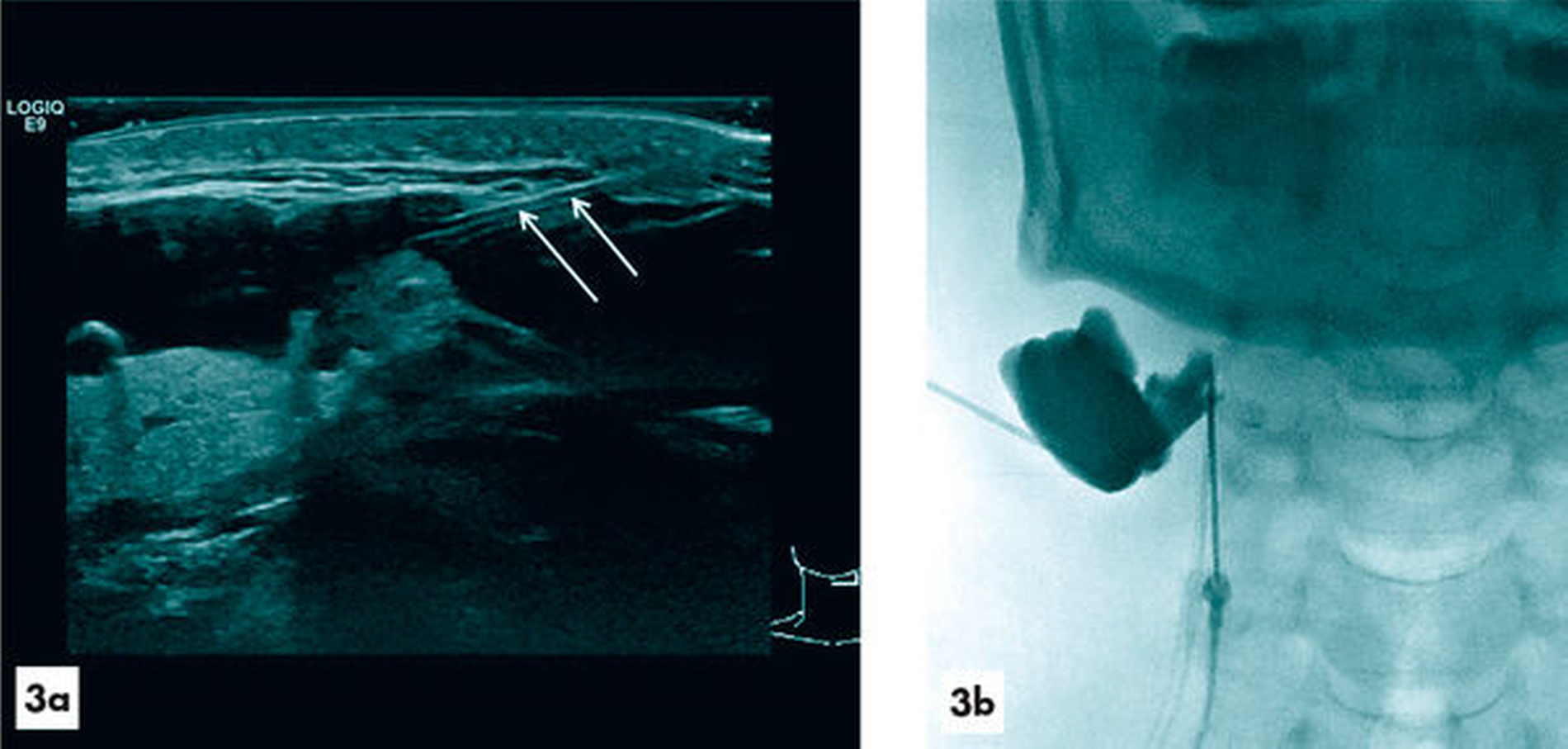 Im Oktober 2018 erfolgte im Universitätsklinikum Regensburg erstmalig die sonografisch gesteuerte Punktion der echoarmen, zystischen Raumforderung, wobei sich eine klare, schleimig-zähe Flüssigkeit aspirieren ließ (Abbildung 3). Wegen der schleimigen Konsistenz der Flüssigkeit, die gegen das Vorliegen einer zu diesem Zeitpunkt nicht infizierten und nicht eingebluteten lymphatischen Malformation sprach, wurde das asservierte Sekret in den Instituten für klinische Chemie und Laboratoriumsmedizin sowie für Pathologie des Universitätsklinikums Regensburg laborchemisch und histopathologisch untersucht. Es wurde als makrophagenreiches Zystenpunktat mit geringgradig neutrophilen Granulozyten und wenigen Lymphozyten gewertet, wodurch die Diagnose einer lymphatischen Malformation eher ausgeschlossen und stattdessen die Verdachtsdiagnose einer Retentionszyste beziehungsweise Tauchranula erhärtet werden konnte.