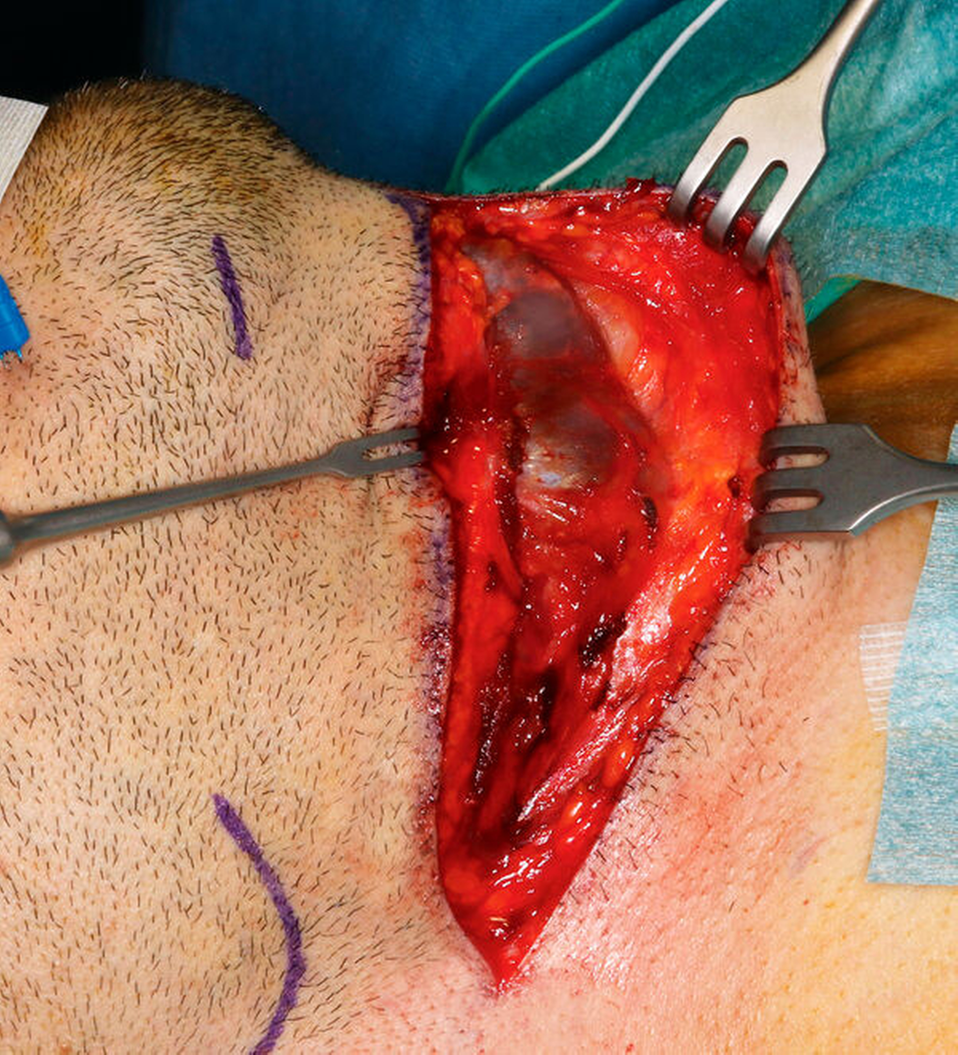 Ein 28-jähriger Patient stellte sich im Januar 2018 mit einer palpatorisch weich-elastischen, fluktuierenden Raumforderung submandibulär rechts nach submental reichend in unserer MKG-Poliklinik vor (Abbildung 1). Die allgemeine Anamnese war bis auf einen Nikotinabusus von 20 Zigaretten pro Tag leer. In der speziellen Anamnese gab er bezüglich des genannten Befunds einen sich über mehrere Jahre ziehenden Krankheitsverlauf an.