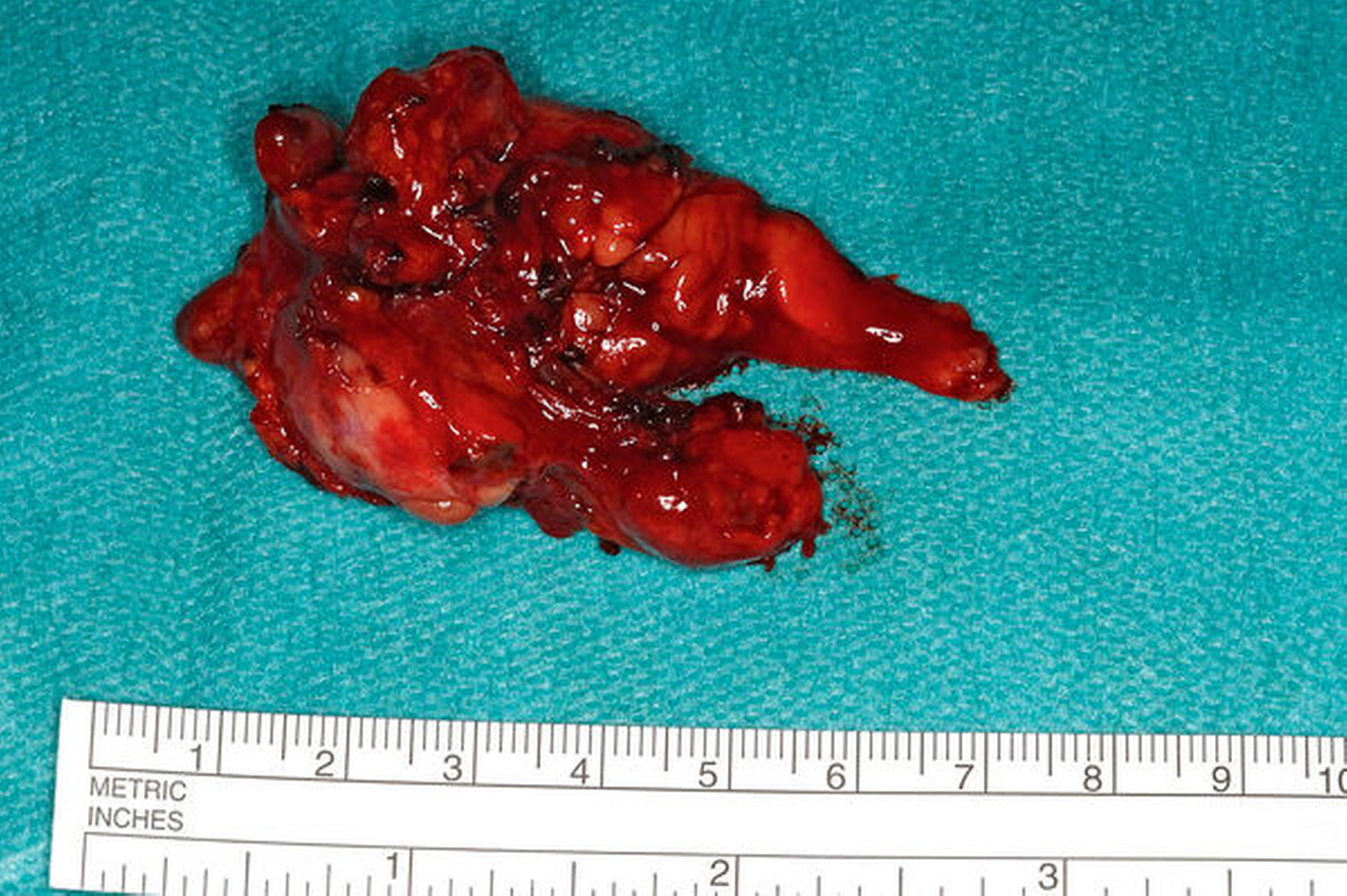 Im April 2019 erfolgte in der Klinik und Poliklinik für Mund-, Kiefer- und Gesichtschirurgie des Universitätsklinikums Regensburg die rechtszervikale chirurgische Exploration unter Neuromonitoring über einen extraoralen submandibulären Zugang. Hierbei zeigte sich subplatysmal eine zystische, äußerst dünnwandige, schleimgefüllte Struktur mit einem Ausmaß von circa 12 cm x 5 cm x 4 cm. Die Raumforderung wurde zusammen mit der Gl. submandibularis rechts unter Schonung des Ramus marginalis n. facialis, des N. hypoglossus und des N. lingualis exstirpiert (Abbildungen 4 und 5). Anschließend wurde von intraoral die Gl. sublingualis entfernt. Der Patient wurde mit Amoxicillin/Clavulansäure antibiotisch abgeschirmt und konnte am dritten postoperativen Tag beschwerdefrei in die ambulante Weiterbehandlung entlassen werden. In der histopathologischen Untersuchung des gewonnenen Präparats zeigte sich eine teilweise regressiv veränderte, gefäßreiche Pseudozystenwand, die lumenwärts von einer CD31-positiven Zelllage (Abbildung 6) mit Nachweis zahlreicher Gefäße im Stroma ausgekleidet war. Bei den ambulanten Nachsorgeuntersuchungen boten sich reizlose Wundverhältnisse und bis dato ist keine weitere zervikale Schwellung mehr aufgetreten (Abbildung 7).