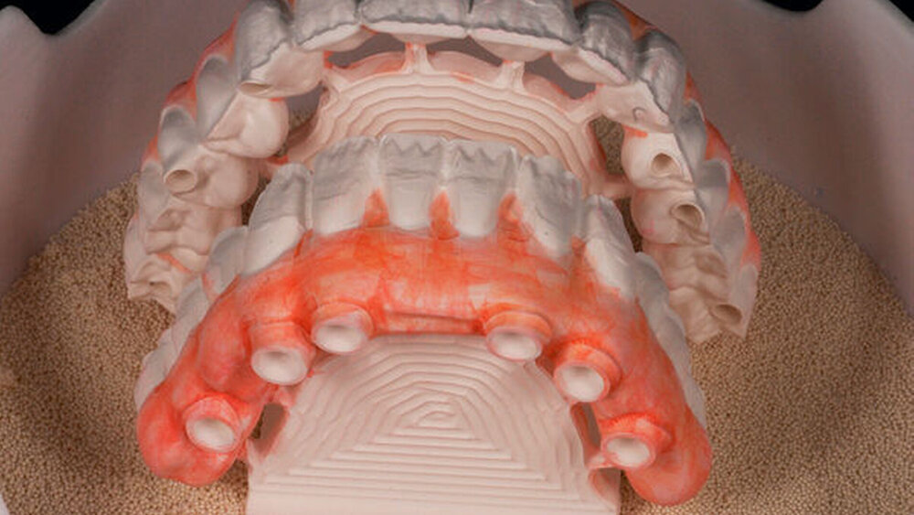 Die Patientin erhielt bereits zu Beginn der Behandlung über das Wax-up sowie Langzeitprovisorien einen Eindruck der fertigen Arbeit. Die schädelbezüglich eingesetzten Implantatmodelle wurden im Artikulator eingescannt und mit den gewonnenen Daten der Interimsprothese gematcht. Das okklusal verschraubte Langzeitprovisorium (LPV) des Ober- und Unterkiefers wurde mit CAD/CAM aus Multistratum Flexible (Firma Zirkonzahn) gefertigt und bei der Einprobe wurde ein Zentrikregistrat genommen. Das LPV wurde in statischer und dynamischer Okklusion eingestellt und der Patientin eingesetzt. Die Patientin war mit Form und Funktion vollends zufrieden.