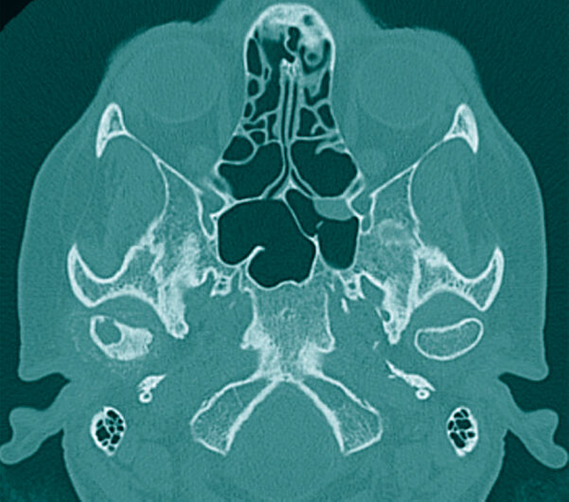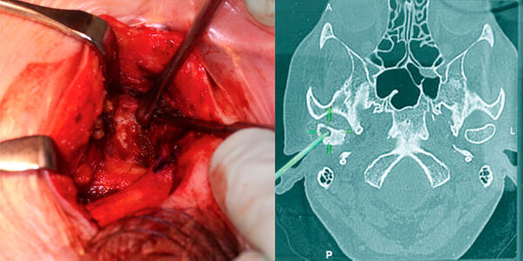 Eine 59-jährige Patientin stellte sich nach Überweisung durch ihren Hauszahnarzt in der Klinik und Poliklinik für Mund-, Kiefer- und Gesichtschirurgie der Universitätsmedizin Mainz mit Schmerzen im Bereich des rechten Kiefergelenks vor. Die klinische Untersuchung ergab eine geringgradige, jedoch druckdolente Schwellung präaurikulär sowie eine schmerzbedingt eingeschränkte Mundöffnung bei einer maximalen Schneidekantendistanz von 2,5 cm. Auf Nachfrage berichtete sie von einer erstmaligen Befundwahrnehmung vor circa vier Wochen mit einer seither bestehenden Zunahme von Schmerzen und Schwellung. Der allgemeinen Anamnese der Patientin war eine Hemikolektomie nach diagnostiziertem Kolon-Karzinom vor zwei Jahren zu entnehmen. Die regelmäßigen Nachuntersuchungen der vergangenen zwei Jahre zeigten diesbezüglich keine Auffälligkeiten.