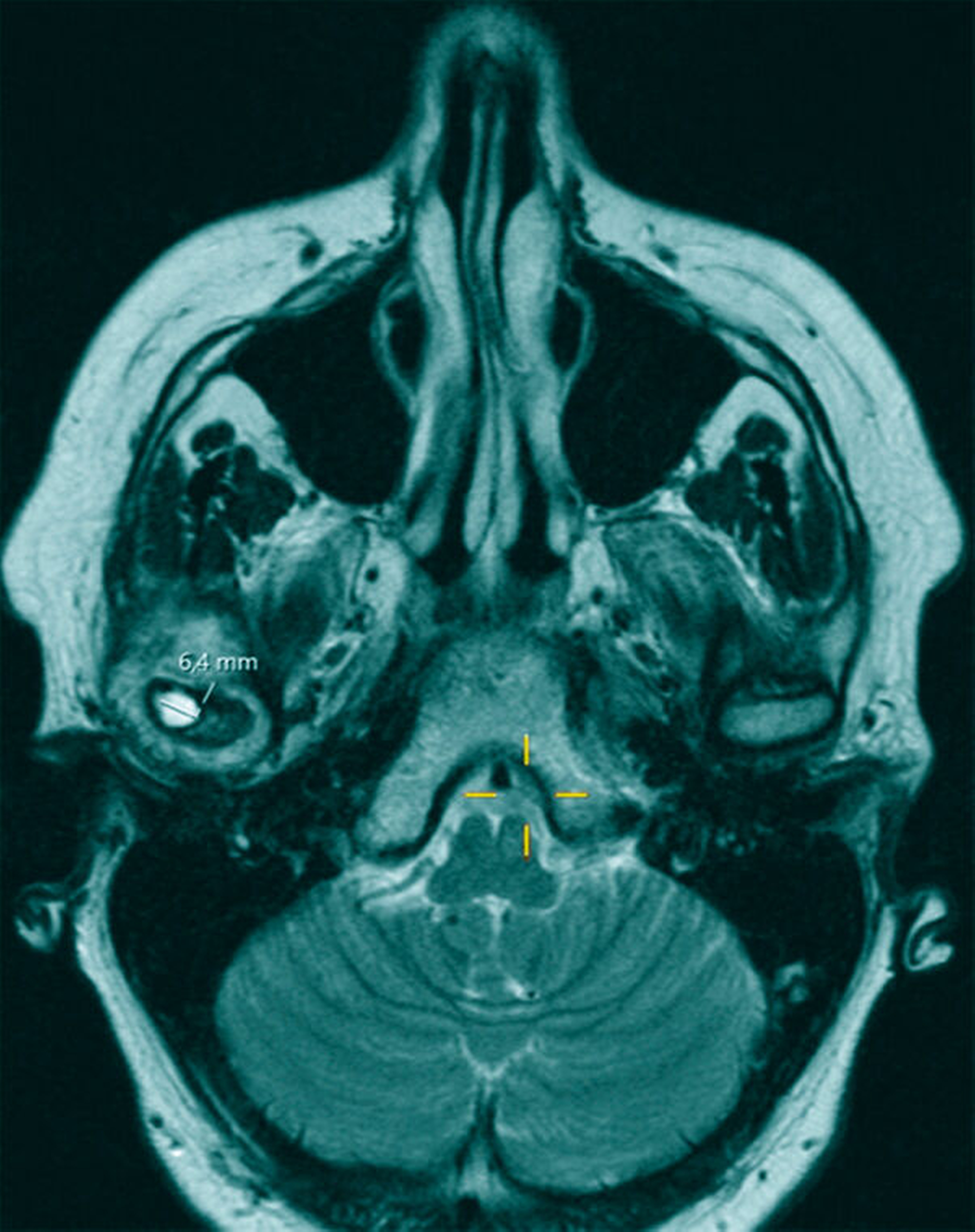 Im Rahmen der klinischen Untersuchung zeigte sich die sonografische Darstellung des Kiefergelenks und dessen angrenzender Strukturen als unzureichend, so dass zur weiteren Diagnostik eine Kontrastmittel-gestützte MRT-Untersuchung des Kiefergelenks eingeleitet wurde (Abbildung 1).