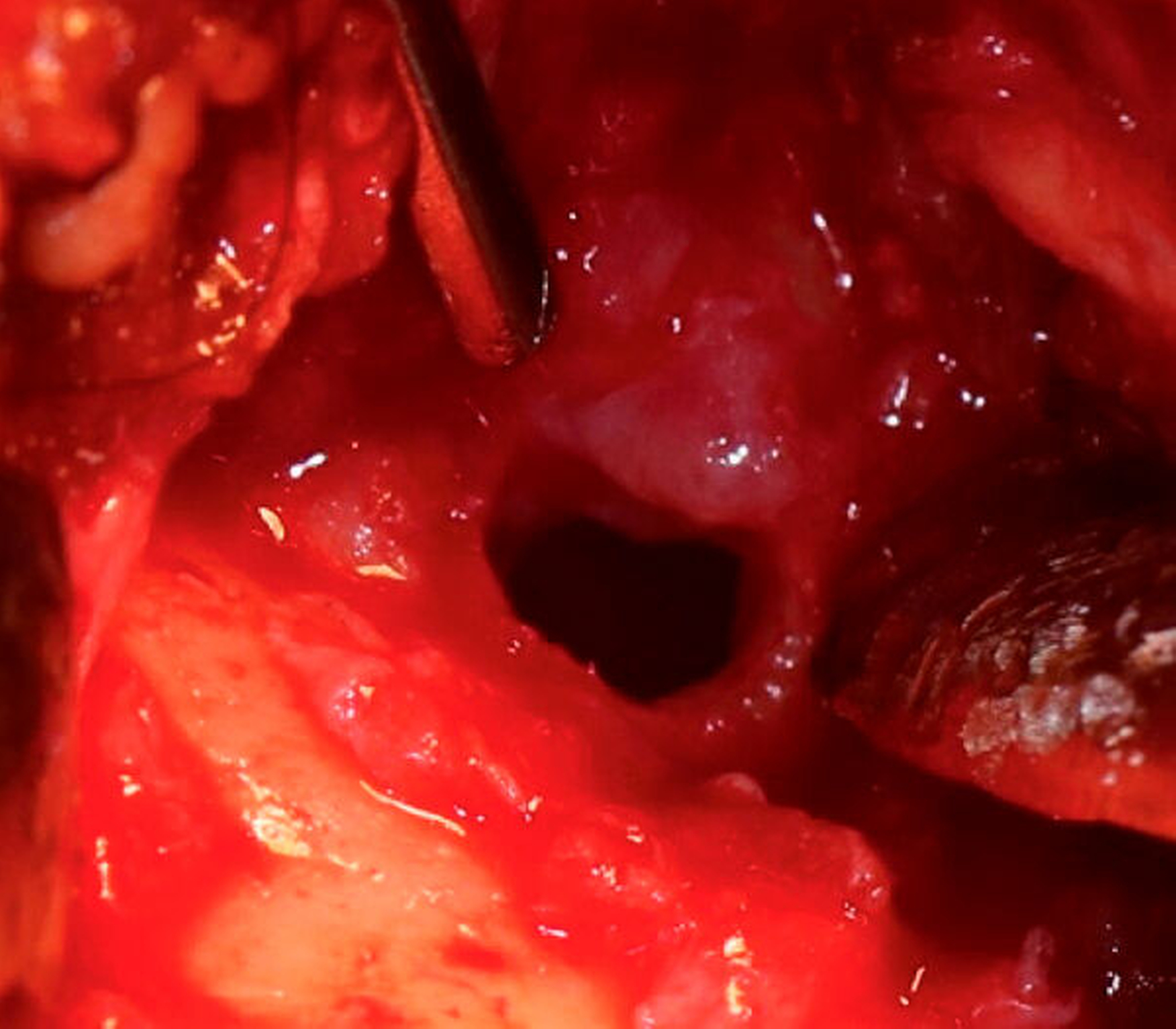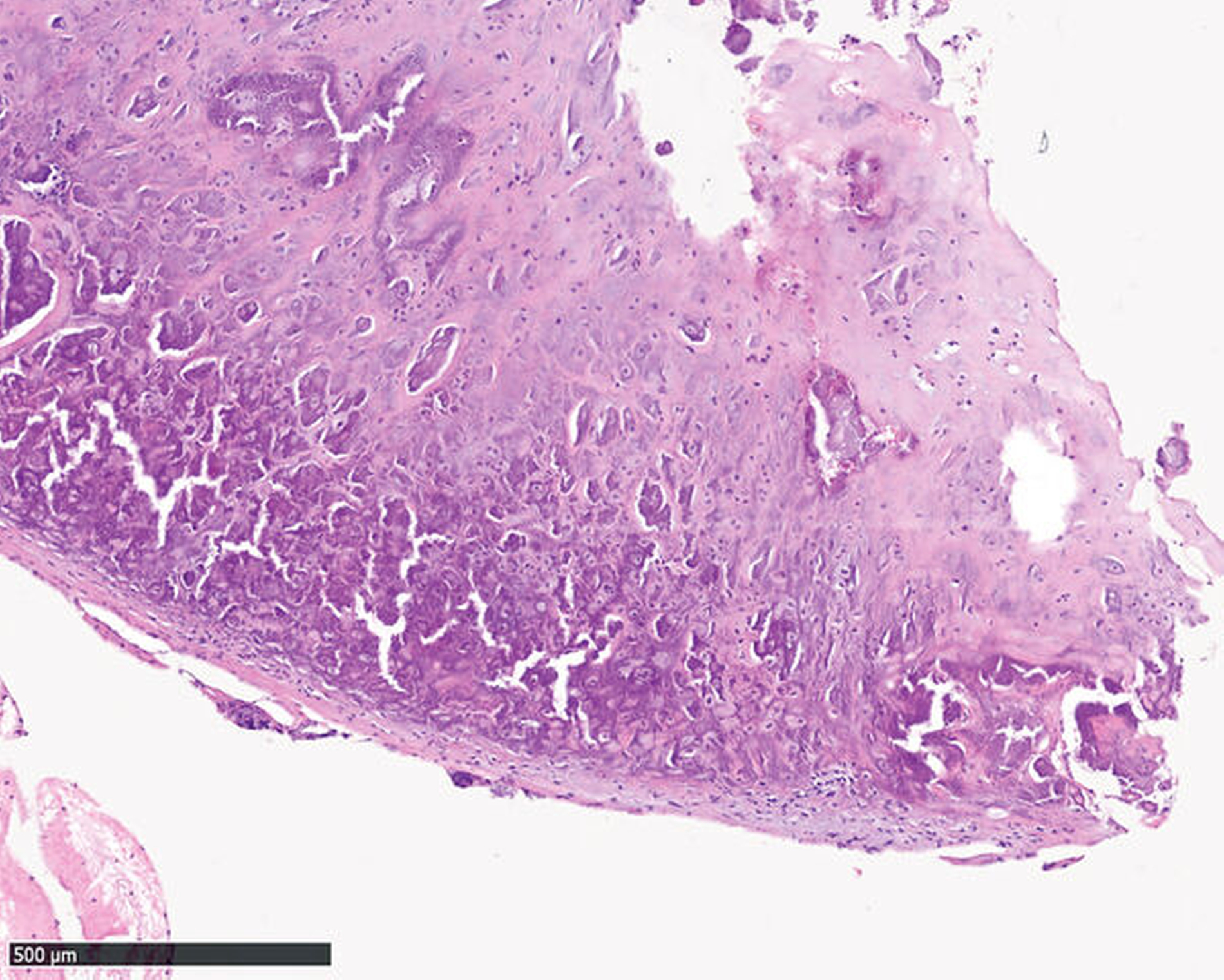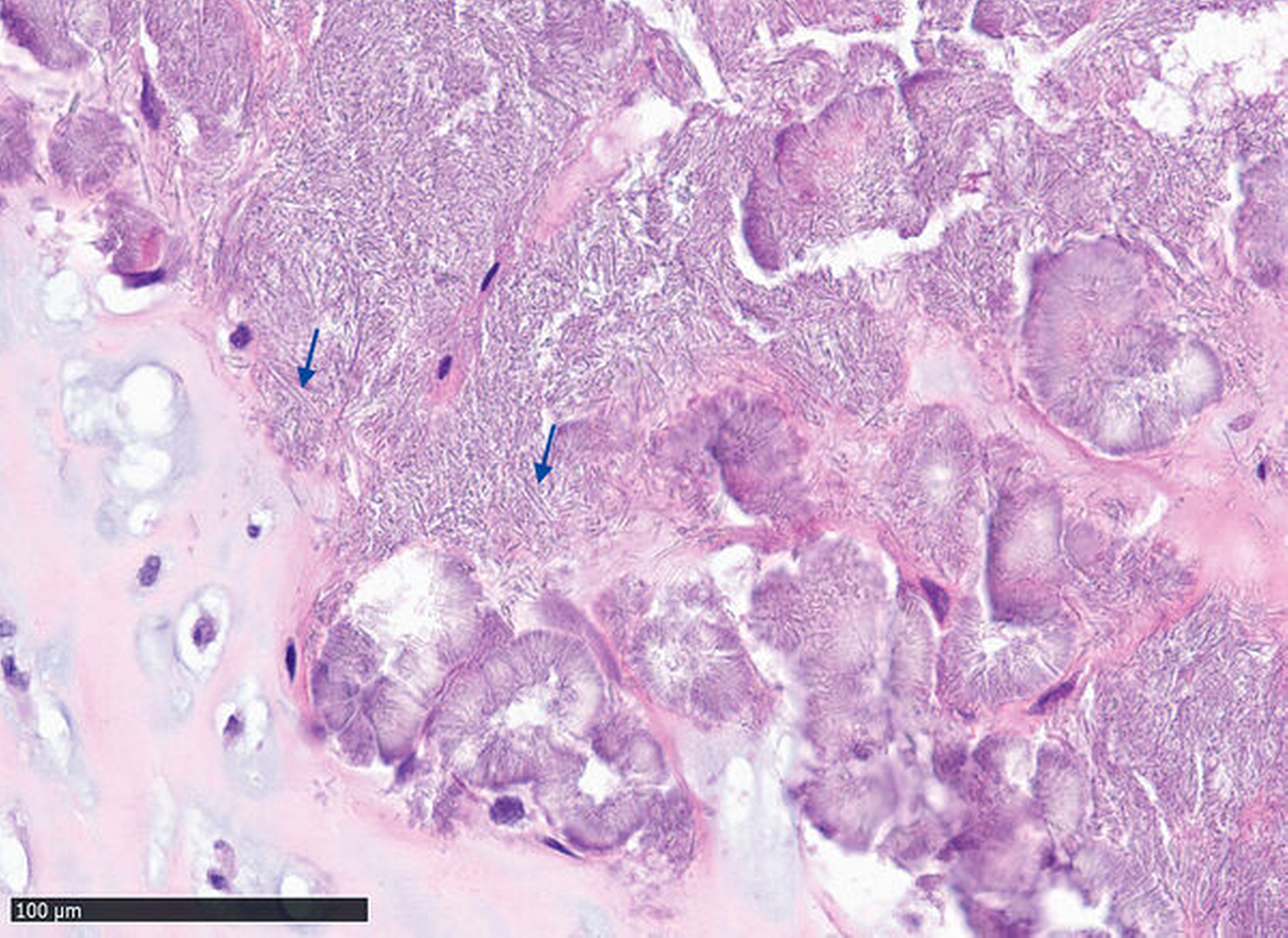 In der navigationsgestützten Probenentnahme in der darauffolgenden Woche präsentierten sich der perikapituläre Kapselapparat als solide kalzifiziert und verdickt sowie der Inhalt des Zystenkavums und die das Kiefergelenk umgebende Raumforderung – die soweit möglich entfernt wurde – als gallertartige Masse mit kleinen, kristallartigen Kalzifikationen (Abbildung 3). Die histopathologische Befundung zeigte die Charakteristika einer Kristallarthropathie mit assoziierter Fremdkörper- und Entzündungsreaktion, passend zu einer Kalziumpyrophosphat- Arthropathie (Abbildung 4). Nach unauffälligem postoperativem Verlauf konnte die Patientin entlassen werden. Im Rahmen der klinischen Untersuchung nach zwei Wochen unter Therapie mit einem nichtsteroidalen Antirheumatikum (NSAR) war sie bei vollständig regredienter Schwellung beschwerdefrei.