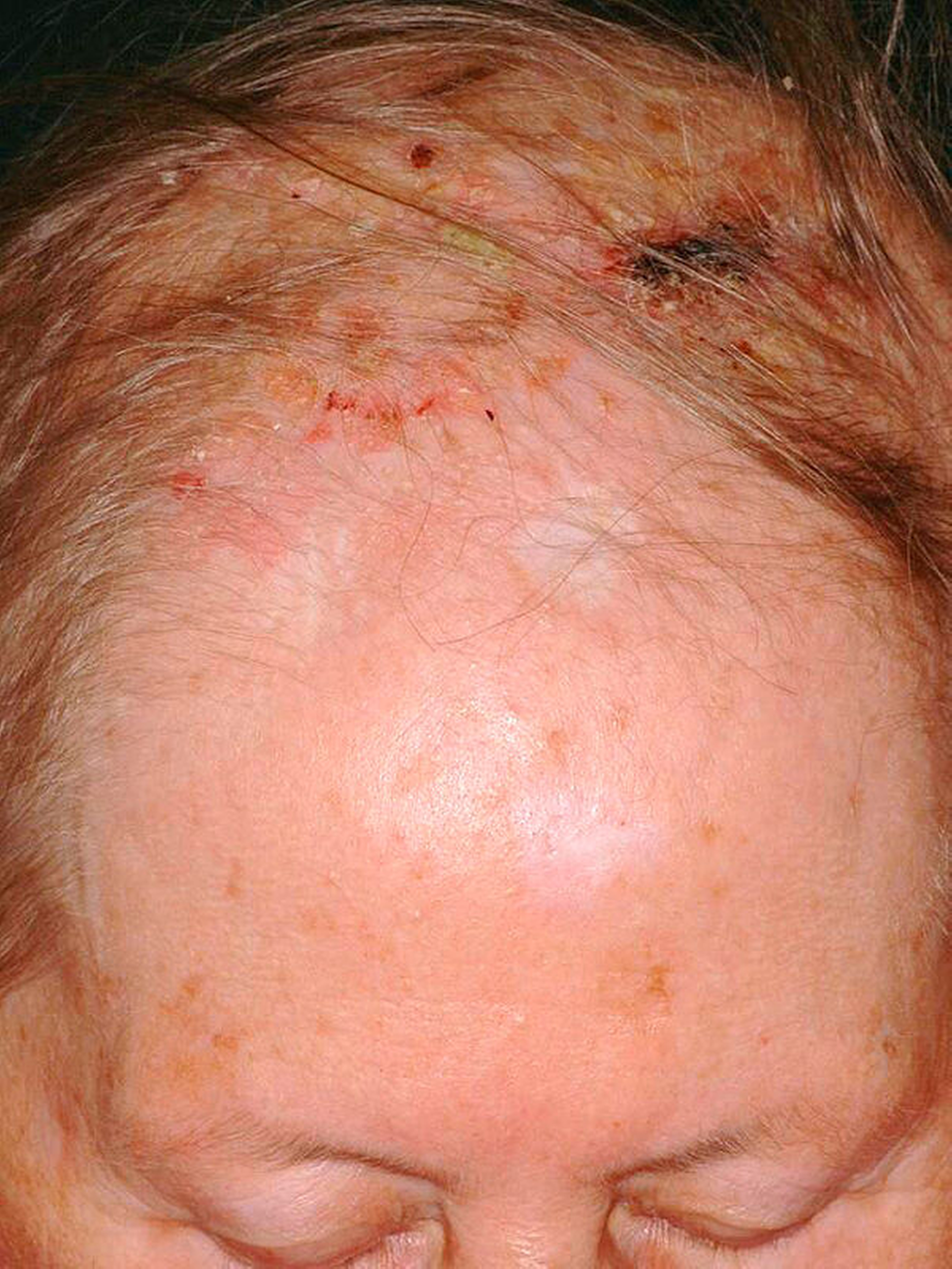 Das Plattenepithelkarzinom entsteht, ähnlich wie das Plattenepithelkarzinom der Mundhöhle, in der Regel auf dem Boden einer Vorläuferläsion (Präkanzerose). Diese wird als aktinische Keratose bezeichnet (Abbildung 7):