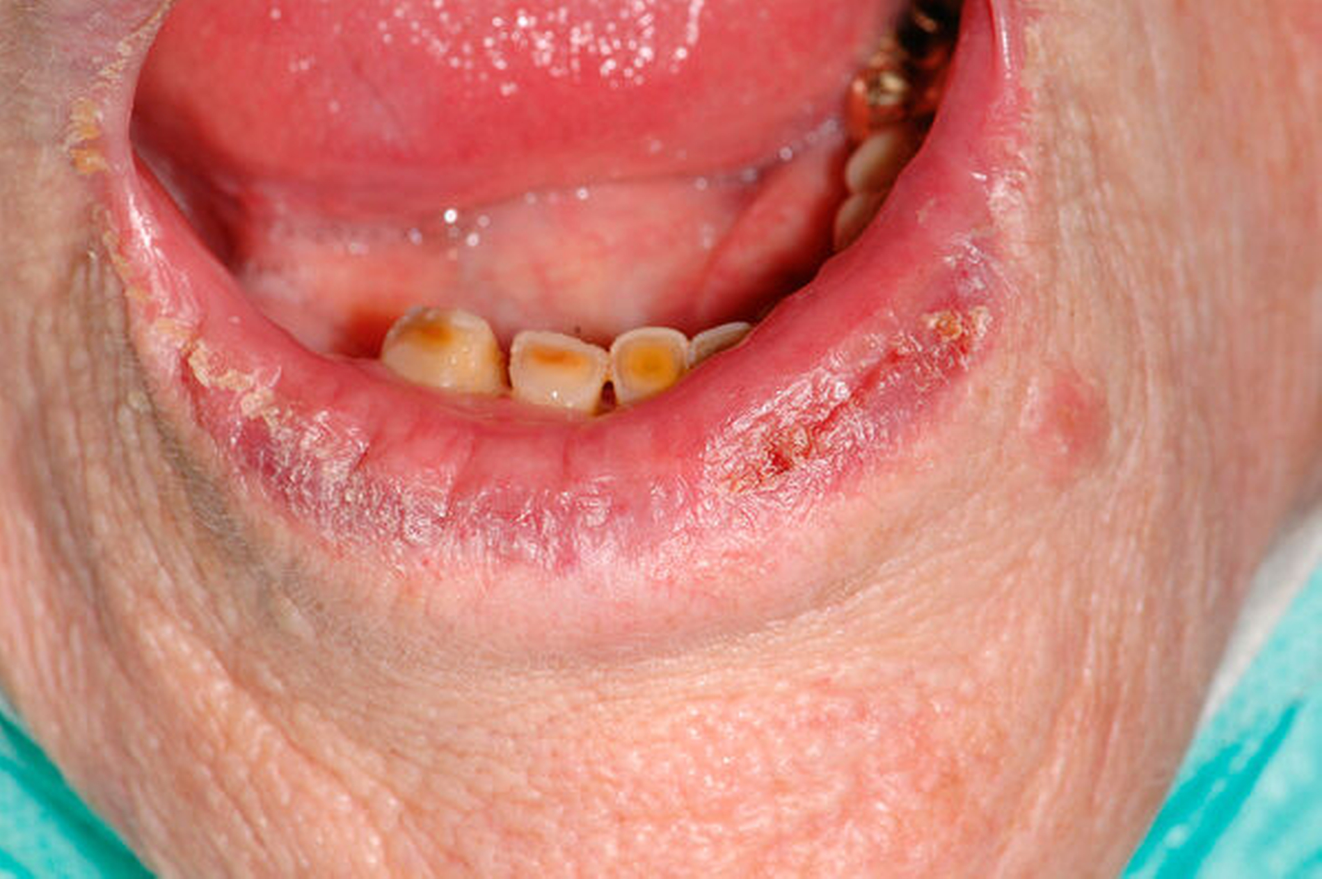 Auch das Lippenkarzinom entsteht auf dem Boden einer Vorläuferläsion, der aktinischen Cheilititis (Abbildung 12), mit folgenden Symptomen: