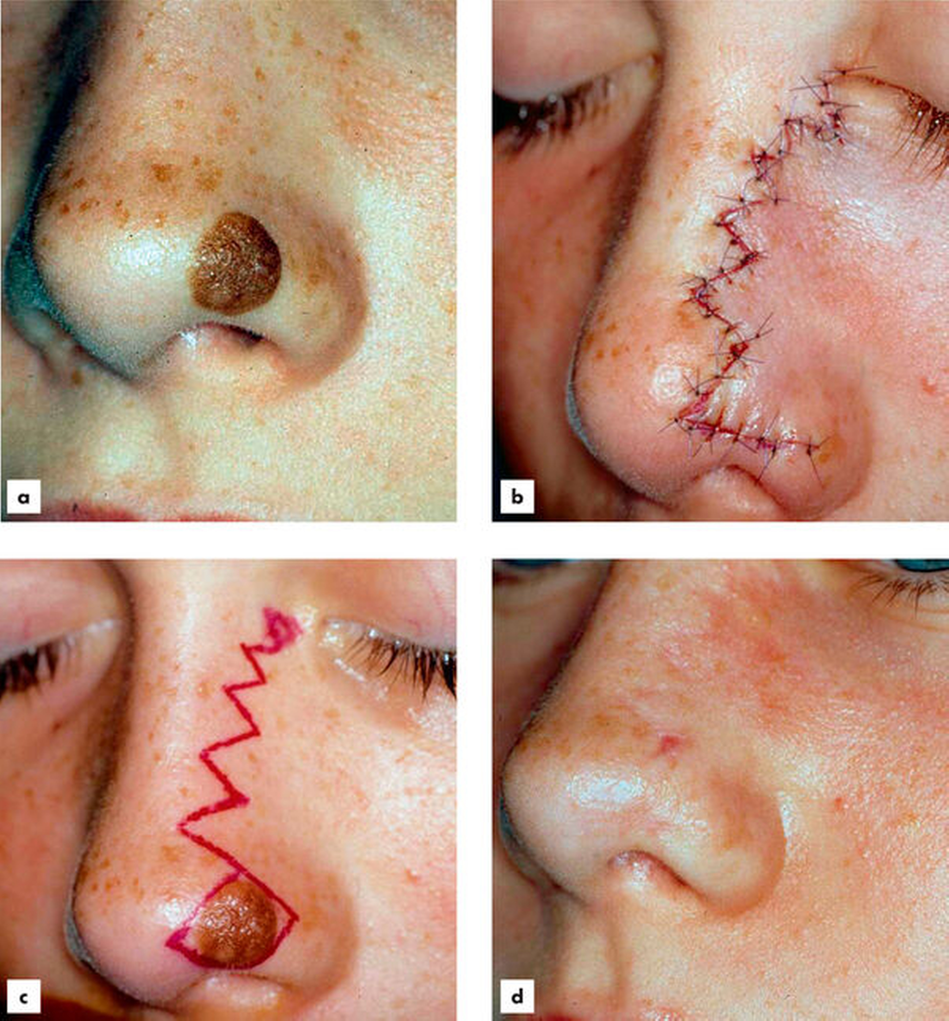 Die wichtigste Therapie der etablierten Hautkrebsläsion ist die vollständige chirurgische Exzision. Die Sicherheitsabstände für Basalzellkarzinome mit histologisch niedrigem Rezidivrisiko im Gesicht liegen bei 3 bis 5 mm, für ein histologisch hohes Rezidivrisiko bei mehr als 5 mm mit lückenloser histologischer Schnittrandkontrolle (Abbildung 19). Die vollständige histologische Schnittrandkontrolle hilft, die Exzision eines Hauttumors nur auf die tumortragenden Hautanteile zu begrenzen und damit unnötige Verstümmelungen zu vermeiden. Wenn der Gesundheitszustand der Patienten eine Operation zulässt, kann meistens im Gesicht die onkologisch kurativ erforderliche Radikalität eingehalten werden, weil Defekte und Funktionseinschränkungen im Mund-, Kiefer- und Gesichtsbereich durch plastisch rekonstruktive Maßnahmen und Gesichtsepithesen gut behandelbar sind. Mund-, Kiefer- und Gesichtschirurgen sowie HNO-Ärzte können unter anderem zu diesem Zweck in Deutschland die Zusatzbezeichnung „plastische Operationen“ erwerben.