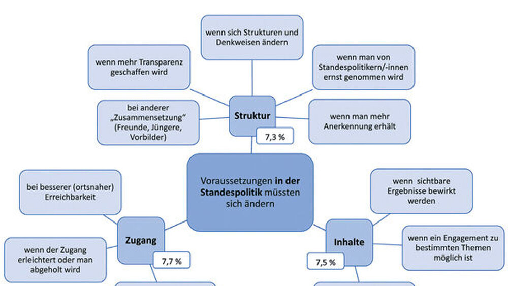 Demnach engagieren sich lediglich 3,3 Prozent der Befragten bereits oder haben sich sehr konkret ein standespolitisches Engagement vorgenommen. Insgesamt 20,8 Prozent der Befragten gaben an, dass sich zunächst die Voraussetzungen in der Standespolitik ändern müssten, damit eine aktive Beteiligung für sie infrage kommt. Veränderungen werden im Hinblick auf die Inhalte, die Strukturen und Denkweisen sowie den Zugang zur Standespolitik gewünscht (Abbildung 1).
