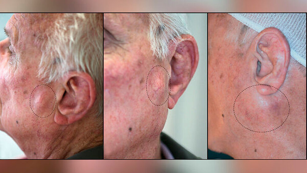 Ein 81-jähriger Mann stellte sich mit einer seit drei Wochen progredienten, indolenten Raumforderung präaurikulär links in der Klinik und Poliklinik für Mund-, Kiefer- und Gesichtschirurgie der Universitätsmedizin Mainz vor. Klinisch zeigte sich ein nicht druckdolenter Befund von palpatorisch 2 cm x 2 cm Größe im Bereich der linken Glandula parotidea (Abbildung 1). Der Patient beklagte weder eine typische Okklusionssymptomatik (Schmerzen vor und während der Nahrungsmittelaufnahme, typisch für einen Verschluss des Speicheldrüsengangs bei Sialolithiasis), noch eine Xerostomie (zum Beispiel im Rahmen eines Sjögren-Syndroms).