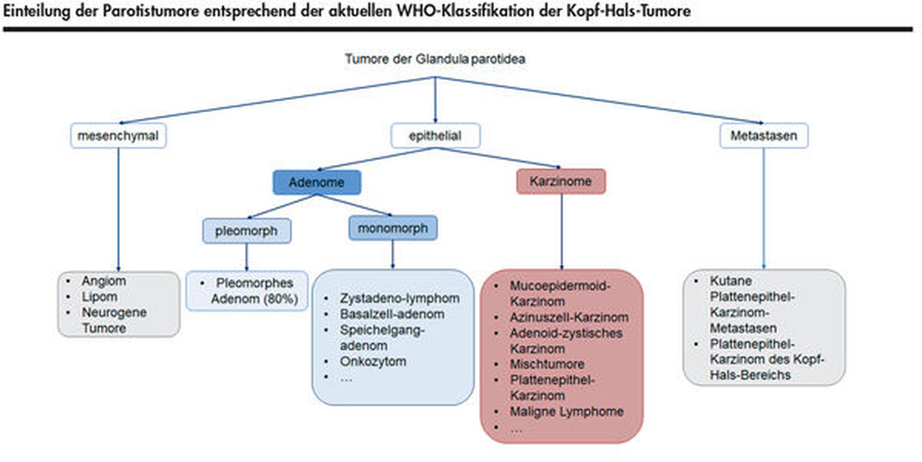 Die grundsätzliche Klassifikation maligner Tumore der Parotis unterscheidet zwischen Befunden unter 2 cm ohne makroskopische extraparenchymale Ausbreitung oder Nervinvasion als T1-Befund, Befunden zwischen 2 cm und 4 cm Größe ohne extraparenchymale Ausbreitung (T2), T3-Tumoren von einer Ausdehnung über 4 cm mit und ohne extraparenchymale Ausbreitung und T4-Befunden mit Vorliegen einer höhergradigen Invasion von Nachbarstrukturen wie der Haut, der Mandibula, dem Gehörgang und des Nervus facialis (T4a) ebenso wie der Schädelgrube und einem Umwachsen der Arteria carotis (T4b) [Alvi et al.,2020].