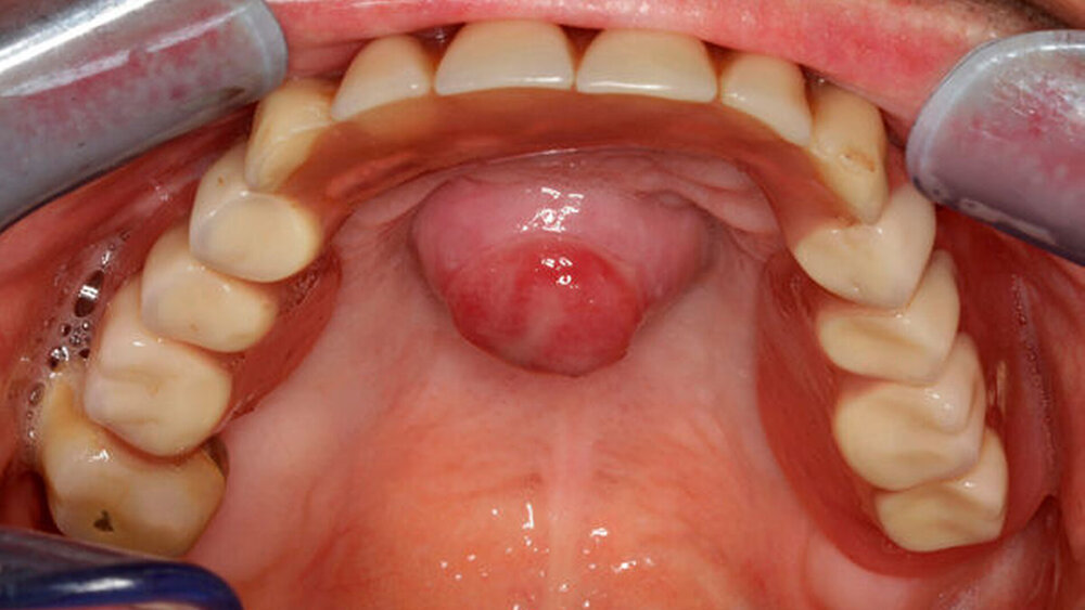 Bei unauffälligem extraoralen Befund imponierte intraoral ein 2 cm x 2 cm großer, zentral im Bereich des harten Gaumens gelegener Tumor (Abbildung 1). Die Raumforderung zeigte sich palpatorisch weich, nicht verschieblich, nicht fluktuierend und prall-elastisch. Die Mundschleimhaut wies in regio 044 und 048 bei Zustand nach operativer Therapie einer Osteonekrose eine narbige Veränderung auf.