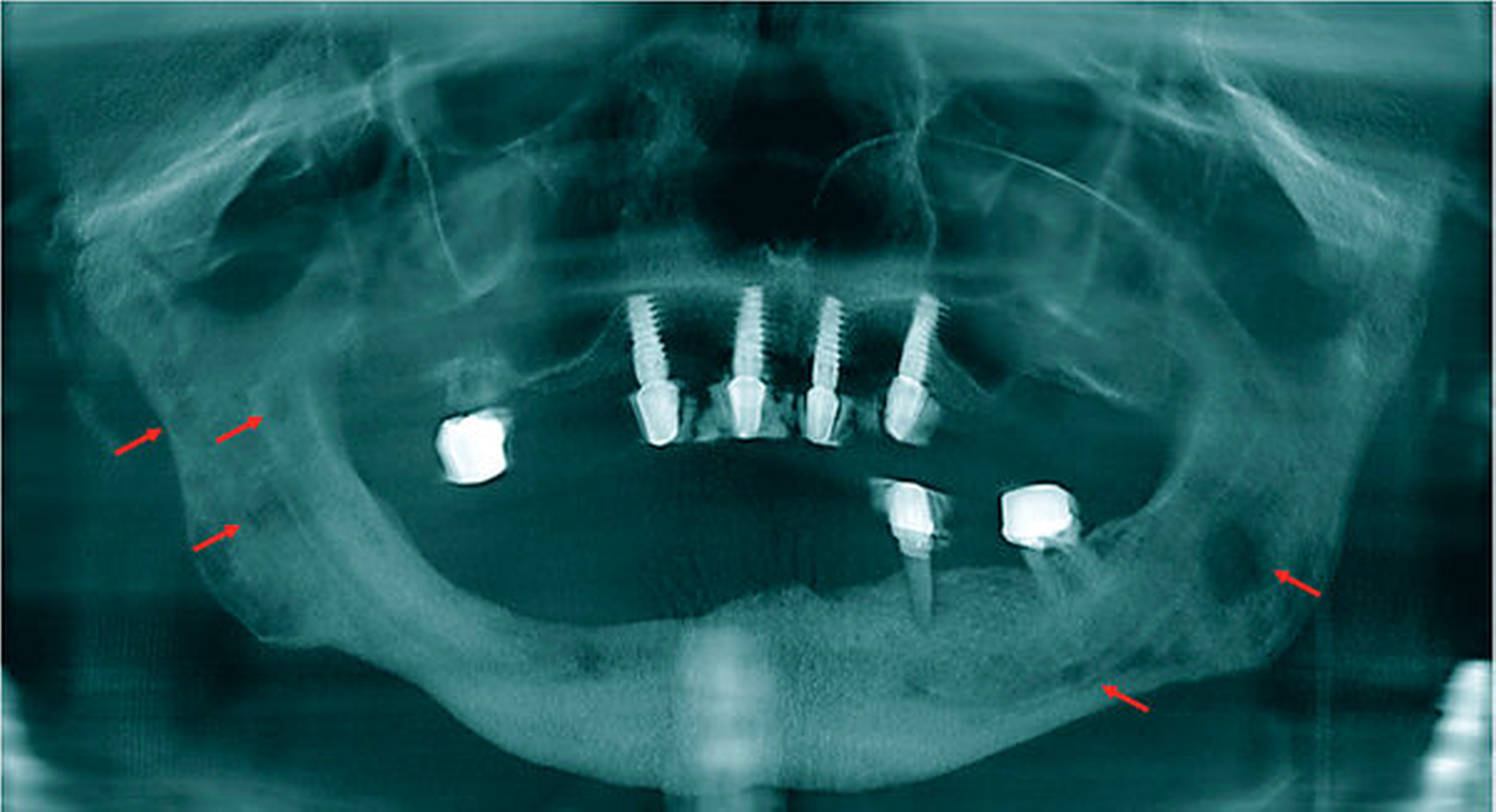 In der Panoramaansicht des aktuellen digitalen Volumentomogramms (DVT) zeigten sich osteolytische Läsionen des Unterkieferknochens sowie eine Minderung der vertikalen Knochenhöhe im vierten Quadranten bei Zustand nach modellierender Osteotomie.
