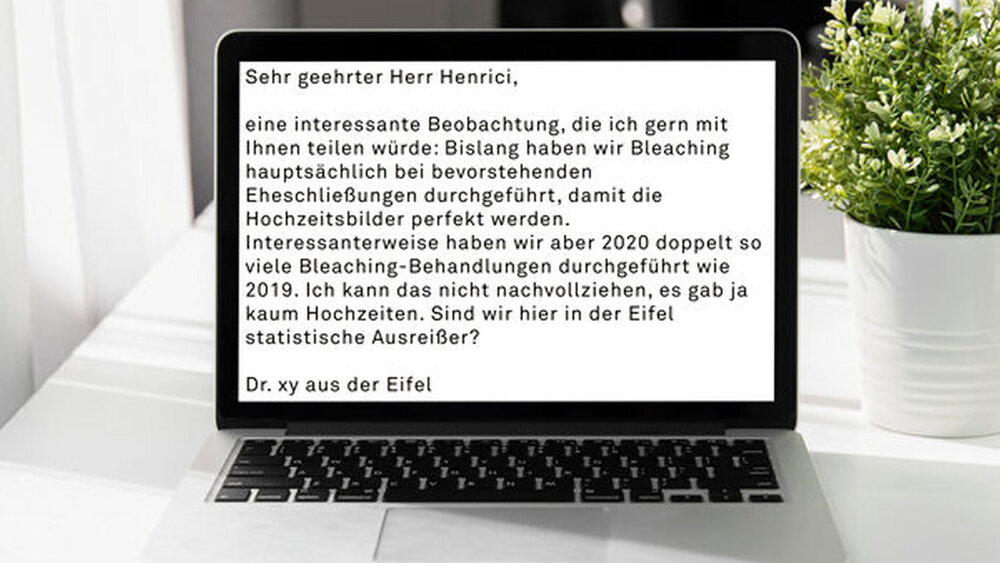 Als Fortführung habe ich einen Leserbrief aufgenommen der stellvertretend für einige mehr steht, die ich in diesem Zweiteiler abhandeln möchte. Auch eine nicht-repräsentative Umfrage einer meiner mandatsgebenden Praxen, die Patienten vor der Bleaching-Behandlung befragte, bestätigte dieses Bild. Die Teilnehmer erklärten ihren Bleaching-Behandlungswunsch so: