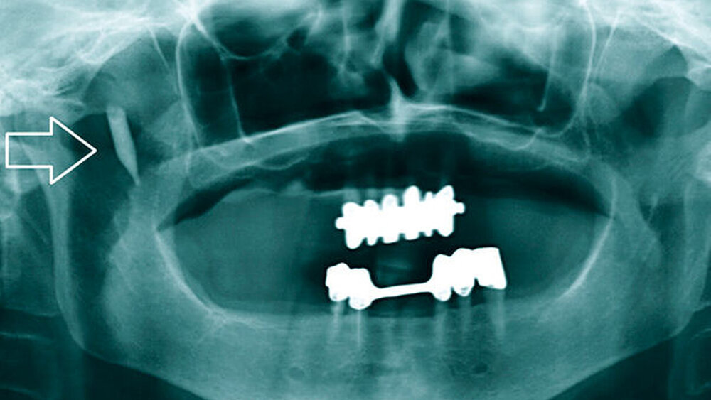 Ein eingesprengter Fremdkörper, der den Nervus mandibularis insbesondere bei Kaubewegungen chronisch reizte, war die Ursache für die jahrelangen Beschwerden der Patientin mit einer massiven Einschränkung ihrer Lebensqualität. Ernüchternd an diesem Fall ist die Tatsache, dass der Fremdkörper trotz der langen Leidensgeschichte und der Vorbehandlungen erst so spät erkannt wurde.