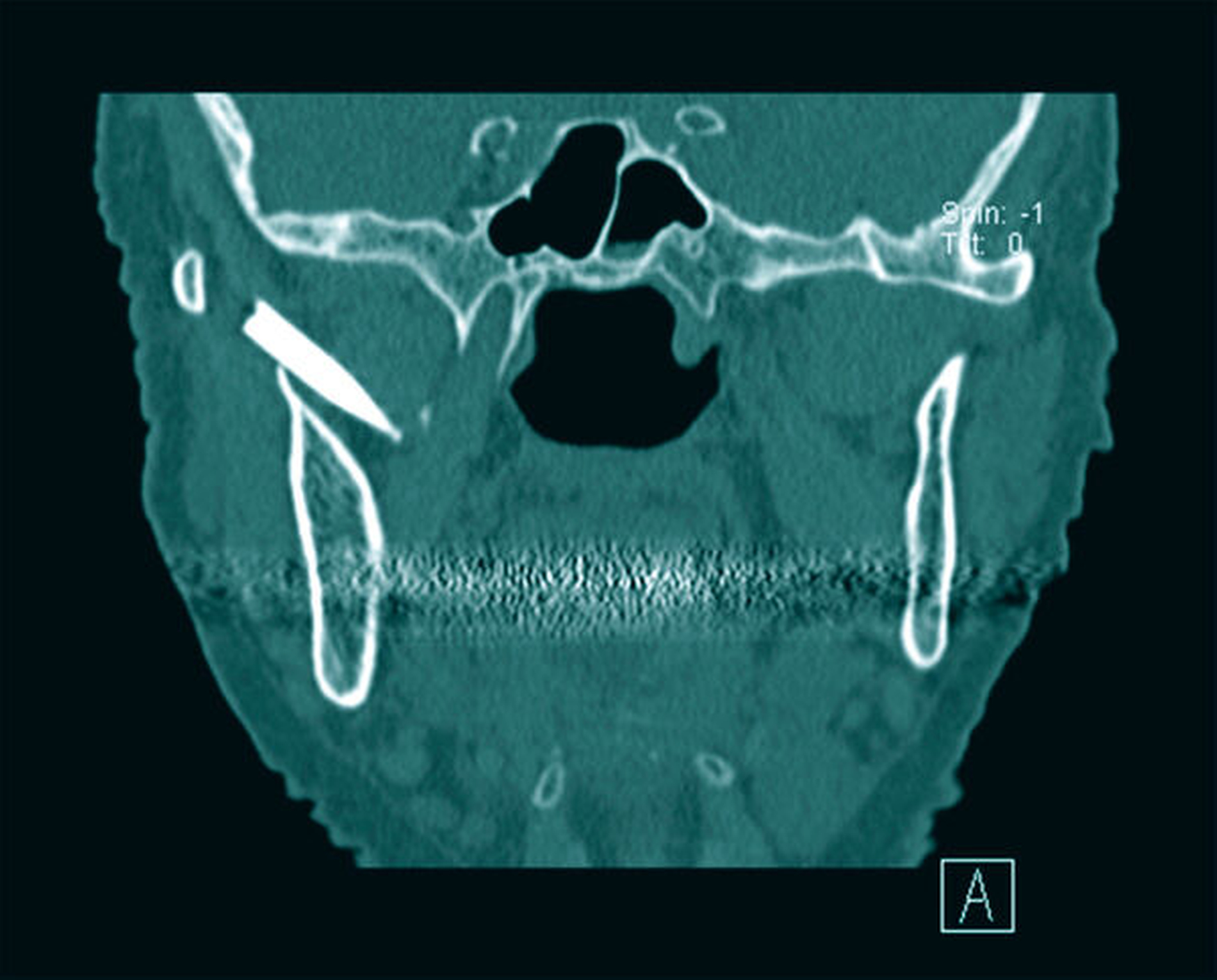 In unserer Praxis wurde zunächst ein Orthopantomogramm (OPG) angefertigt, auf dem neben einem prothetisch und konservierend versorgten Restgebiss im Bereich des rechten Kiefergelenks eine unklare, länglich-ovale Verschattung erkennbar war (Abbildung 1). Differenzialdiagnostisch vermuteten wir einen Fremdkörper oder eine langstreckige Gefäßverkalkung. Die Patientin konnte sich aber an keine Verletzung oder mögliche andere Ursachen einer Fremdkörpereinsprengung erinnern, woraufhin eine Computertomografie (CT) zur weiteren Diagnostik veranlasst wurde.