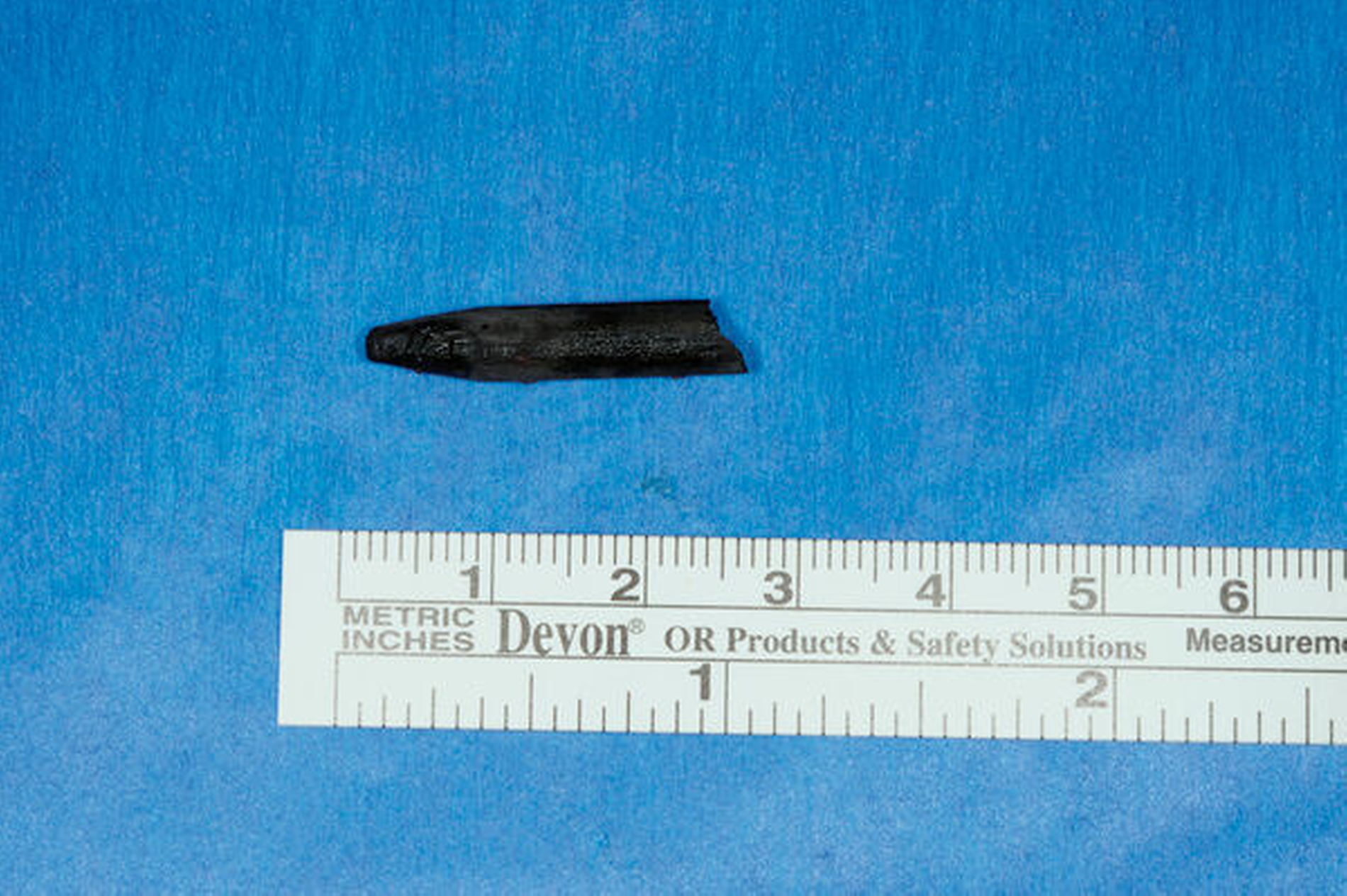Der Schieferstift wurde daraufhin unter stationären Bedingungen in der Mund-, Kiefer- und Gesichtschirurgischen Klinik des Universitätsklinikums Erlangen komplikationslos durch einen enoralen Zugang entfernt (Abbildungen 4 und 5). In der postoperativen Phase nahmen die Beschwerden der Patientin kontinuierlich ab und verschwanden schließlich vollständig. Die langjährige Schmerzmedikation mit Carbamazepin konnte nach Entlassung aus der stationären Behandlung ausgeschlichen werden.