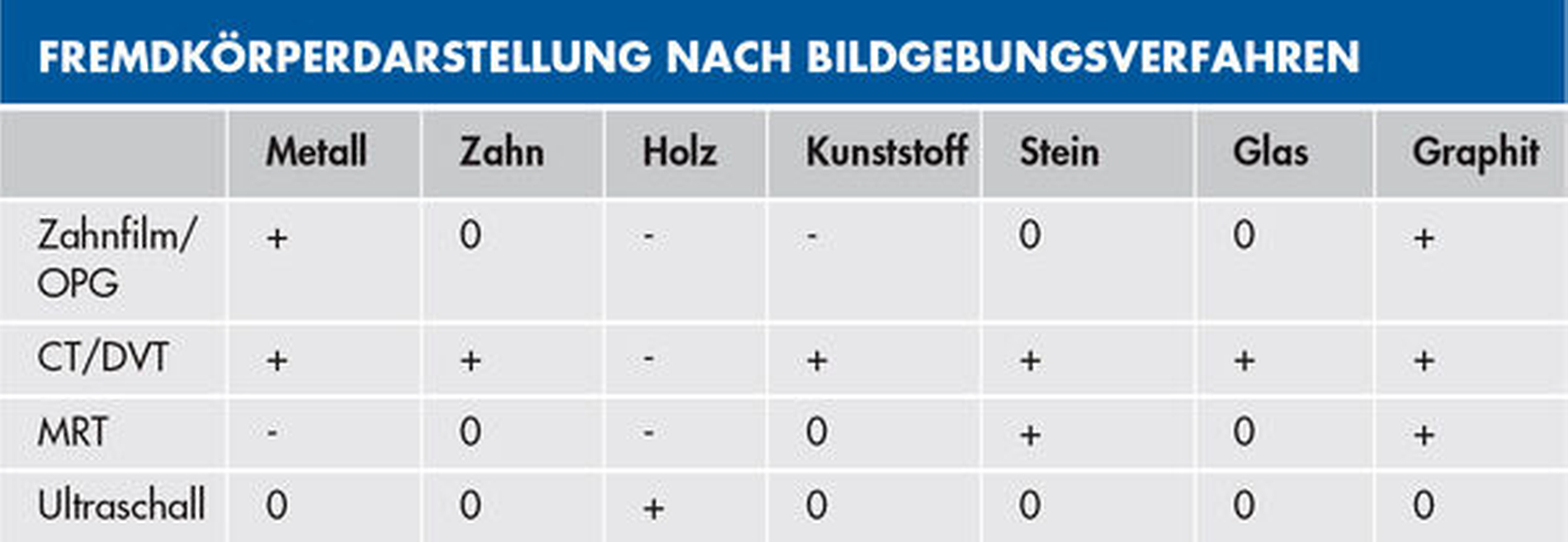 Neben der Lage ist bei der Darstellbarkeit eines Fremdkörpers auch das Material entscheidend (Tabelle 1). In den konventionellen zahnärztlichen Röntgenaufnahmen (Zahnfilm und Panoramaschichtaufnahme) lassen sich beispielsweise Metall und Graphit verlässlich abbilden; Fragmente sind erst ab einer Größe von über 2 mm gut erkennbar. In der dreidimensionalen Bildgebung erreicht man sowohl mit dem CT als auch mit dem DVT die bestmögliche Darstellung fast aller Materialien. Eine Ausnahme stellt die Darstellung von Holzpartikeln dar. Hierbei kann eine Ultraschalluntersuchung hilfreich sein [Kaviani et al., 2014; Javadrashid et al., 2015].