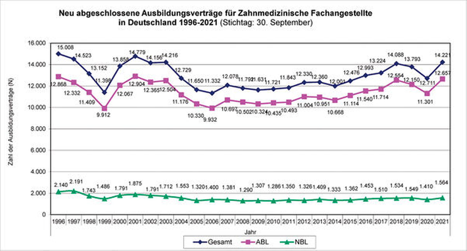 Insgesamt 14.221 neue Ausbildungsverträge zur ZFA wurden zum 30. September 2021 abgeschlossen (Westen: 12.657, Osten: 1.564). Das ist ein Plus von + 11,8 Prozent gegenüber dem Vorjahr (Westen: + 12 Prozent, Osten: + 10,9 Prozent).